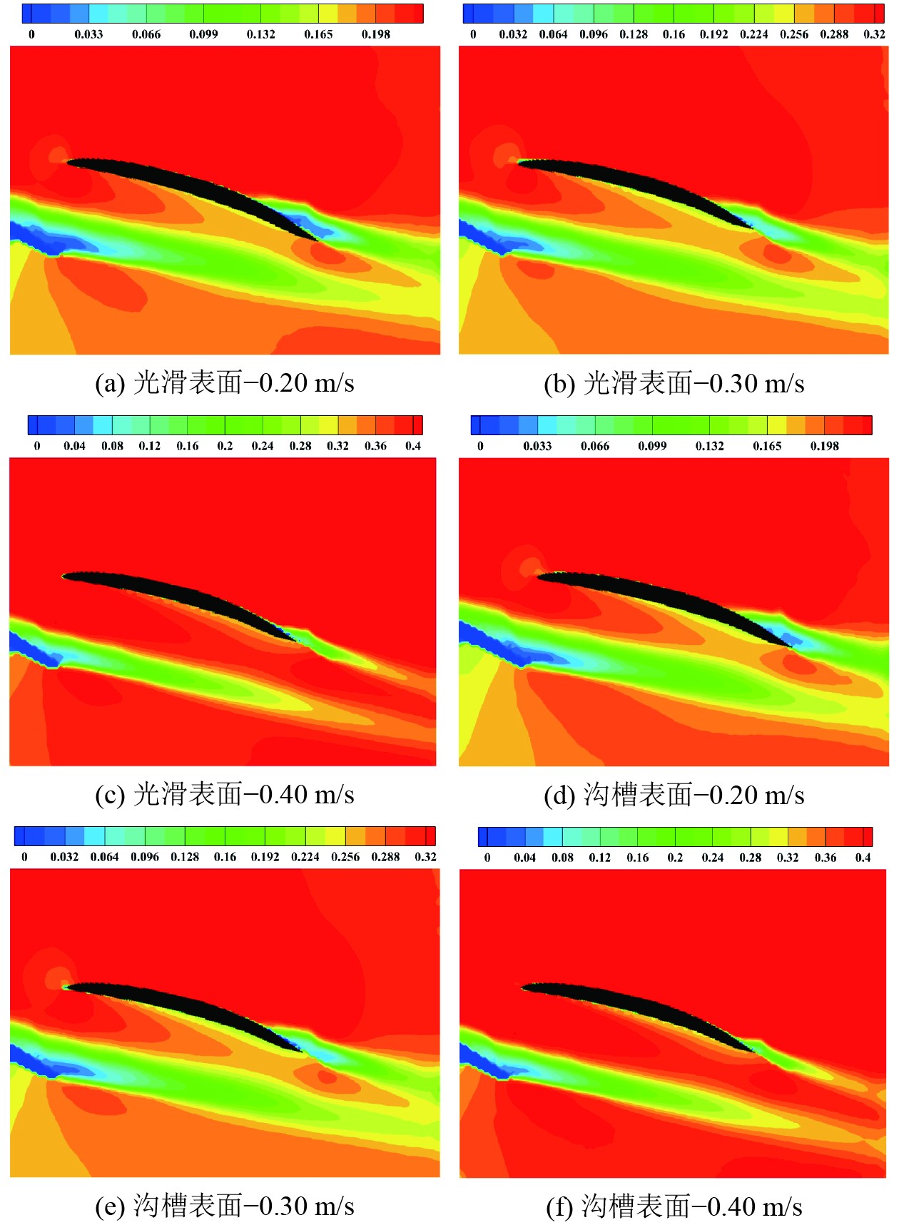 为了研究不同雷诺数下,顺流向沟槽对于翼型表面流场的变化影响,选取了0.20、0.30以及0.40 m/s的流速进行研究,翼型与来流迎角固定为15°。选取