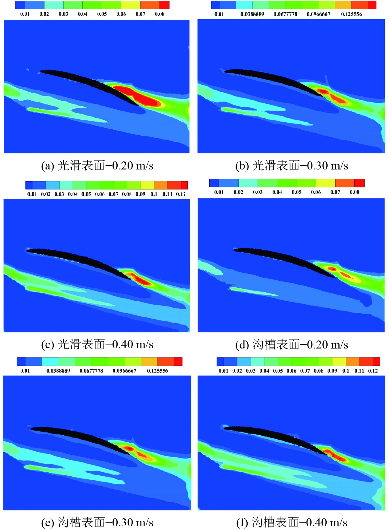 图6进一步给出了固定迎角15°,不同流速情况下的翼型表面的湍流度场,其中图6(a)~图6(c)为光滑表面,图6(d)~图6(f)为沟槽表面。可以看出,随着流速的增加,翼型表面的湍流度呈现增加的趋势,其中翼型后缘的最为明显,该区域的湍流强度明显增加,并且范围逐渐扩大,逐渐出现流动分离的现象,而翼型的下表面处的湍流度略微增加。在相同流速工况下,流速u=0.2 m/s和u=0.3 m/s时,不论是大小还是范围,翼型下表面的湍流度基本不变,而在尾缘处的湍流度降低,范围减小,流场中的速度脉动被抑制。而当流速增大到u=0.4 m/s时,沟槽表面翼型下方湍流强度明显增加,表面沟槽的存在可能对于翼型水动力产生了消极作用。