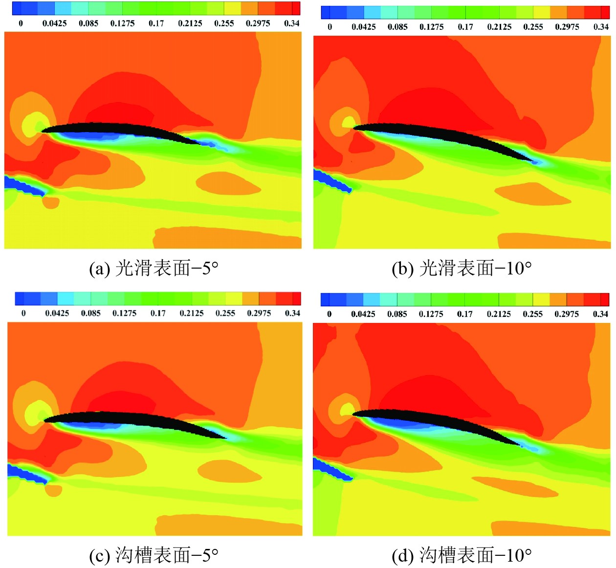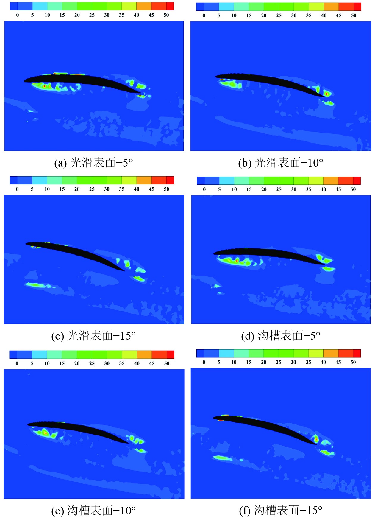 图7给出了流速固定u=0.3 m/s,不同迎角下翼型表面的平均流场分布。结合图5综合分析可以发现,迎角为5°和10°工况下的流场变化更为明显,翼型前缘下表面的速度较为平缓,随着迎角的增加,光滑翼型下表面的低速区域范围减小,当迎角增加到15°时,下表面的低速回流消失。在迎角为5°和10°工况下,相较于光滑表面翼型,存在沟槽一面的速度峰值明显减小,并且翼型下表面前端的低速区域范围扩大了近1.5倍,平均速度场沿壁面法向的变化区域缓和,壁面剪切应力减小,进而导致结构受到的粘性阻力减小,流体流经表面所需要的能量消耗减小,流速相对更快,因此在该工况下,沟槽的存在对于流场具有积极作用。除此以外,在沟槽的作用下,流体流经表面后依然可以保持更多的动能,导致尾翼处的低速回流区强度和范围减小,2个翼型之间的流速增加。