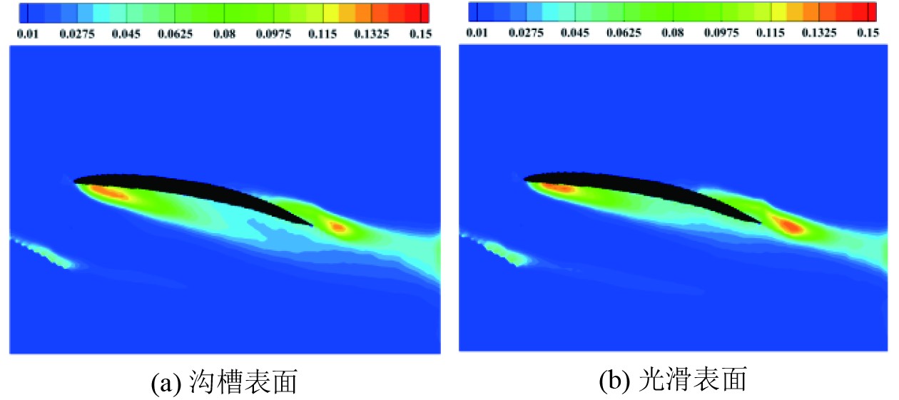 图8为翼型迎角10°、流速u=0.3 m/s工况下的平均湍流度场。从图8(a)可以发现,翼型前缘的湍流度明显减小,并且高湍流度区域的部分从图8(b)中贴附于壁面的形式逐渐远离壁面,近壁面的速度脉动降低,湍流强度降低,相对而言流体更为稳定。在翼型中后段,湍流区厚度出现增加的现象,但是相比光滑表面来说,沟槽翼型近表面处的湍流度依旧处于低湍流度状态,因此沟槽的存在降低了近表面的速度脉动,一定程度上抑制了近壁面的湍流生成。