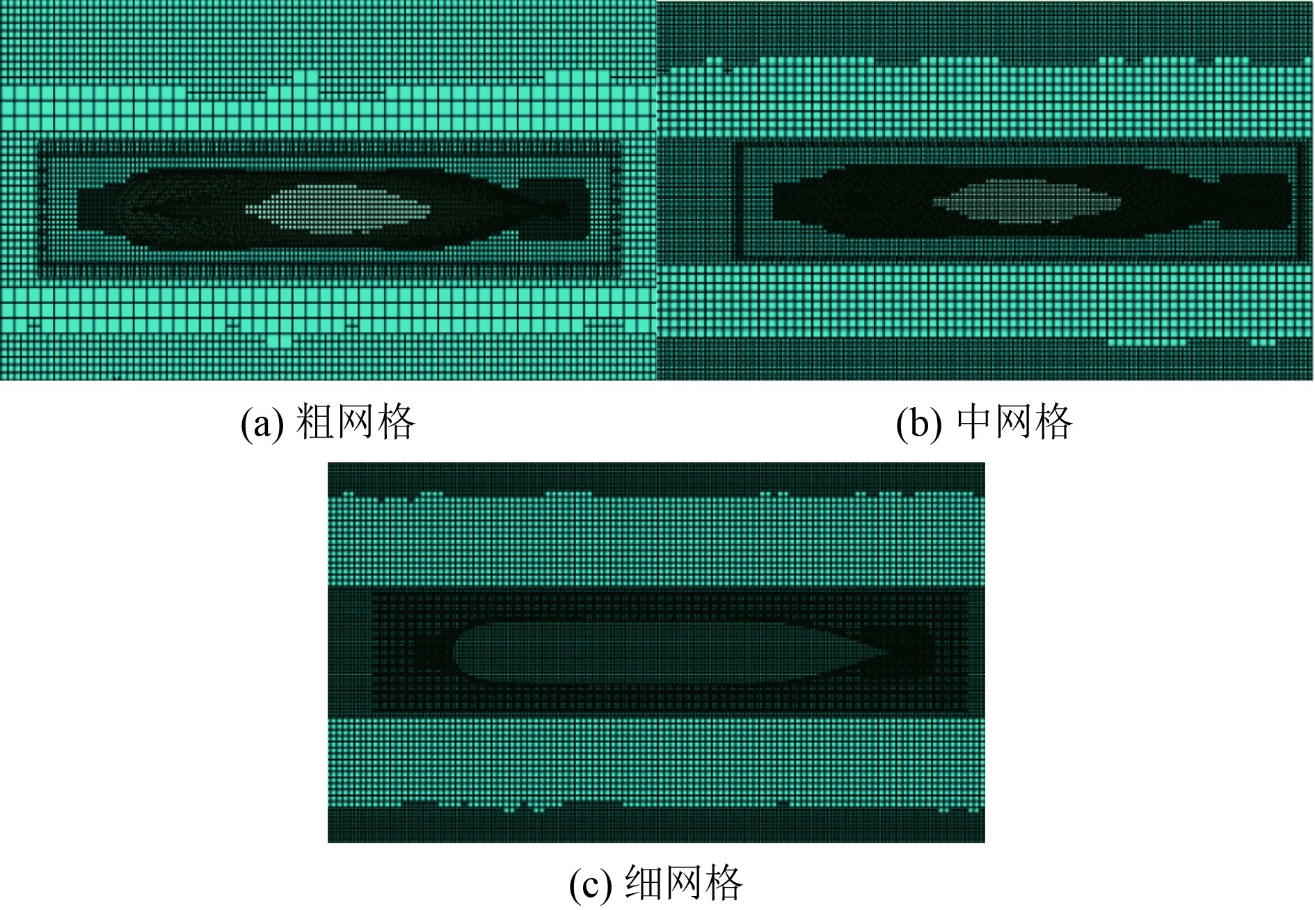 在CFD数值模拟中,网格划分与数量对模拟结果的准确性有着一定影响。因此在模拟大量工况前需要进行网格收敛性分析。该文选取ITTC的相关方法,使用粗、中、细3套网格进行对比,网格划分局部示意图如图5所示。相关计算式为: