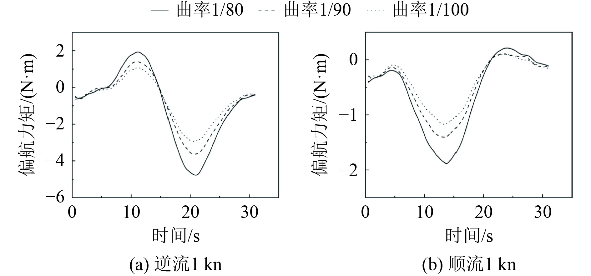在逆流工况时,船舶所受偏航力矩出现明显的正负值交替。船舶航行到约12 s时,出现明显的峰值,说明船身受到岸壁的吸引力向岸壁移动,岸壁曲率为1/80时,偏航力矩数值为1.9 N·m。当船舶继续航行到约21 s时,船舶大幅度偏离岸壁,直至船舶即将航行结束,力矩逐渐减弱接近0。