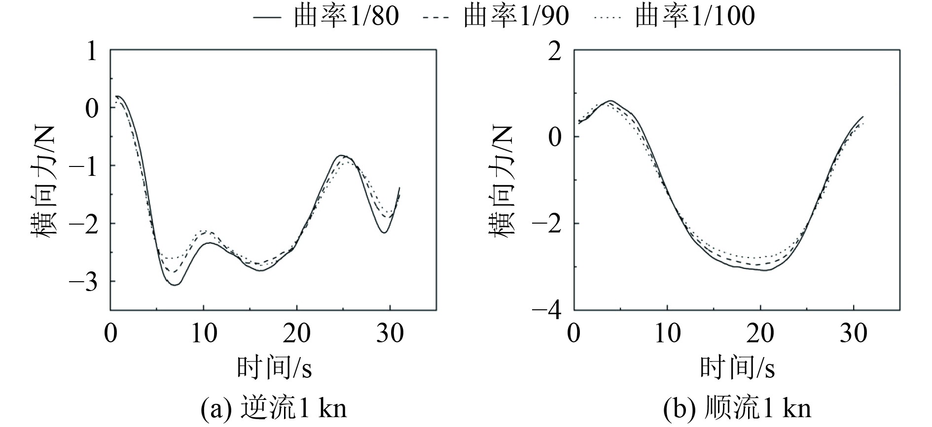 在顺流工况时,由于船舶受岸壁的吸引力向岸壁移动,船舶在约19 s时,3个曲率都出现较高的横向力峰值,当曲率为1/80、1/90、1/100时,所对应的横向力峰值分别约为1.5、1.1、0.9 N。这表明随着岸壁曲率的增大,横向力值也越大,船舶所受岸壁效应也越大。