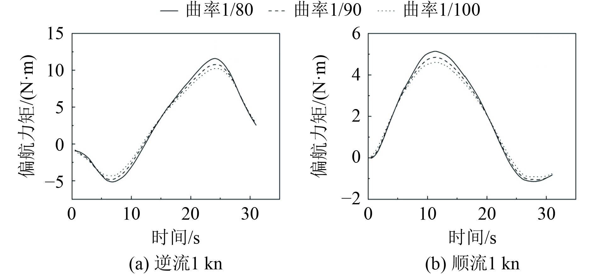 如图9所示,在逆流条件下,船舶初始阶段航行受逆流水动力影响,导致船舶偏离岸壁。当继续航行至约24 s时,偏航力矩达到峰值。岸壁曲率为1/80时偏航力矩值最大为12 N·m。随后继续航行,偏航力矩逐渐下降。