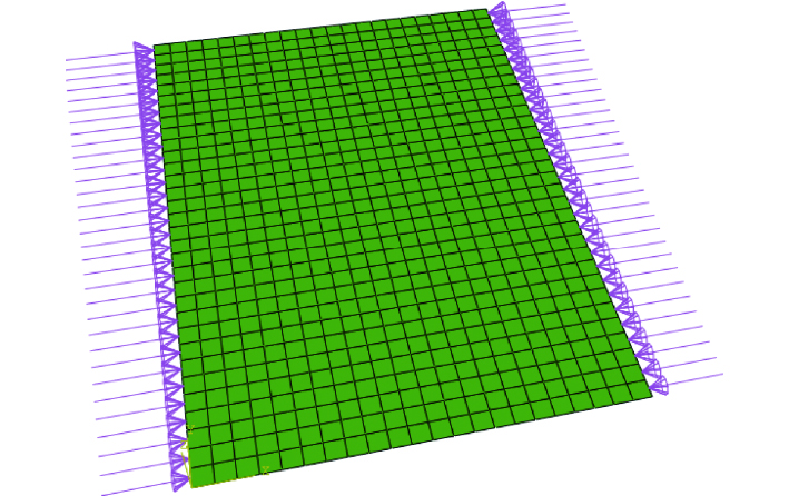 边界条件设置的基本原则是:1)所有边保持直线;2)受压一边固定x方向线位移和y,z方向角位移,另一边可自由平面移动,但运动轨迹应保持平行直线;3)非受压边在z轴方向上固定,但平面移动轨迹应保持两对边平行。加载方式为:正应力为板边缘均布线载荷,如图2所示,剪应力为沿板边缘点载荷,且约束较为特殊,如表3所示。