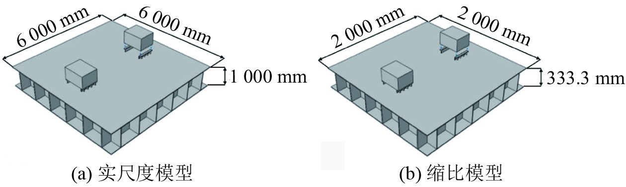 在实尺度模型基础上按照1∶3比例严格开展理论缩比模型设计,根据结构与几何相似关系得到缩比模型[13 − 15]。双层底结构尺寸为