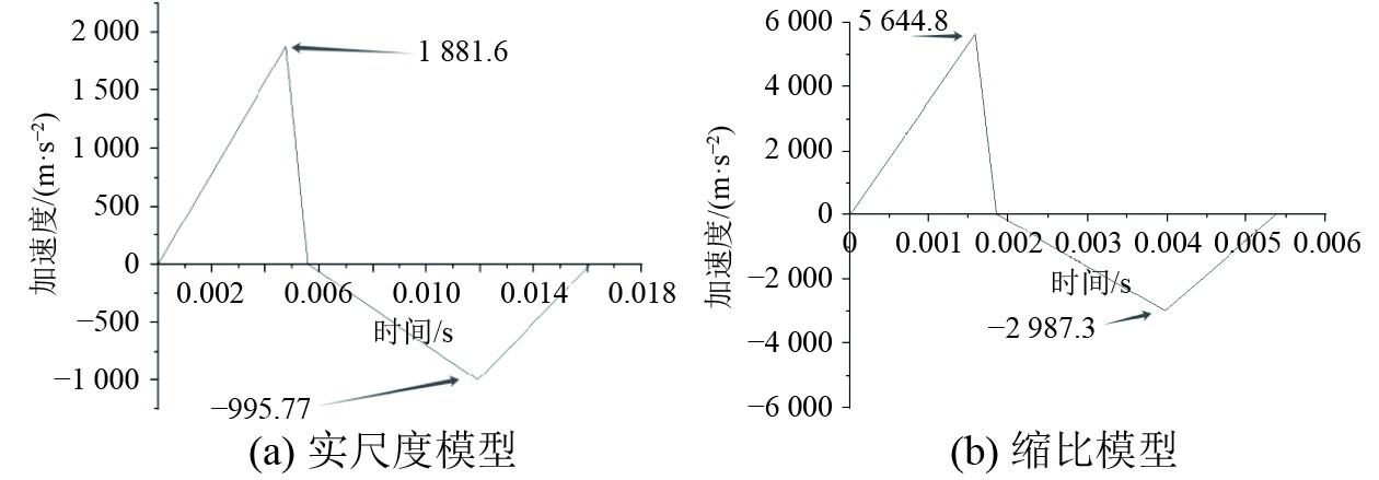 根据式(1)~(6)计算得到实尺度模型加速度时域载荷,见图2(a),根据相似理论将实尺度模型三角加速度峰值放大3倍,冲击时间缩小3倍得到如图2(b)所示缩比模型加速度时域载荷。