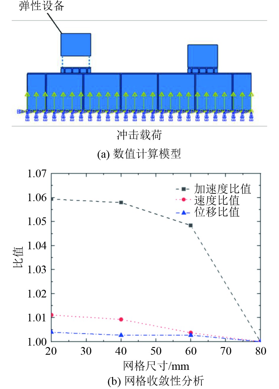 数值计算中网格尺寸过大会存在离散化误差、数值稳定性差和含入误差等问题,而网格尺寸过小将存在计算效率过低等问题,为了获得可靠的结果,需要开展网格收敛性分析。以本文实尺度模型为计算对象,计算模型网格尺寸分别设定为20、40、60、80 mm,其他参数不变,提取不同工况基座相同测点处的结果开展对比分析,以20 mm结果为基准,其他尺寸与其比值见图3(b)所示,基座加速度、速度和位移响应峰值随着网格尺寸减小同步变大,但是趋势逐渐变缓,最大相差约6%,可见4种网格尺寸都能反应冲击载荷下结构的响应特性,考虑模型计算规模和效率最终选择40 mm作为结构模型网格尺寸。