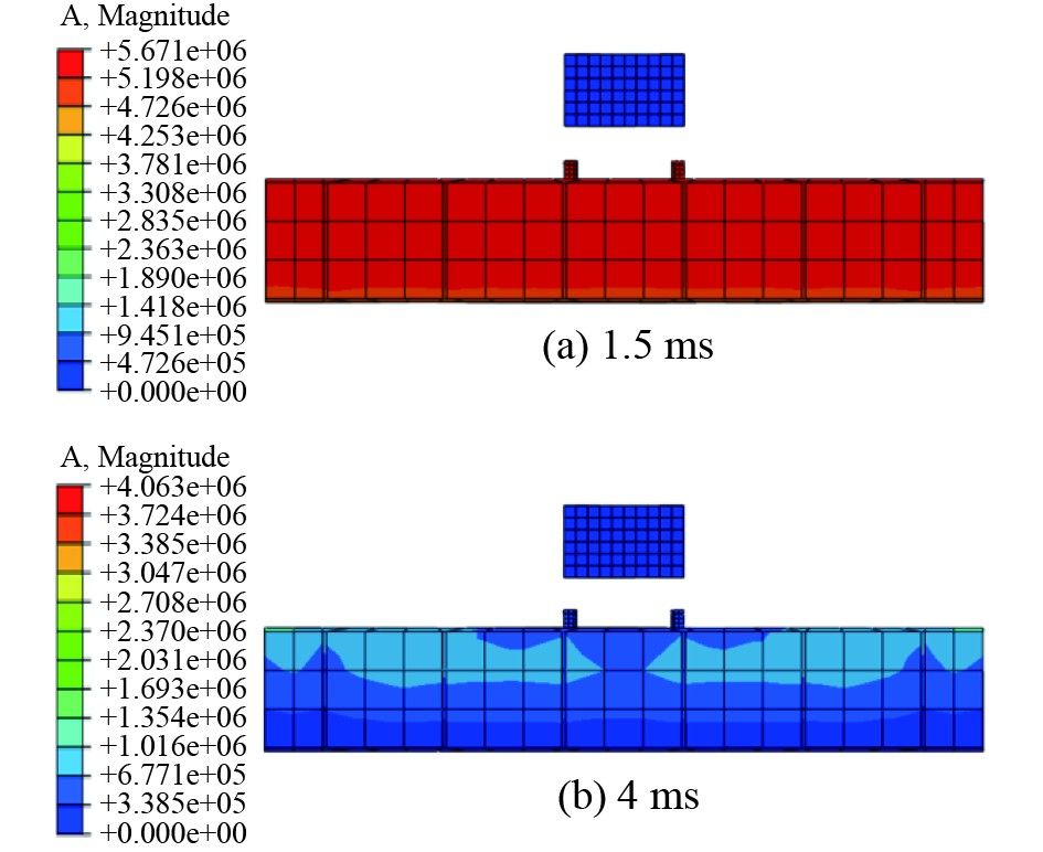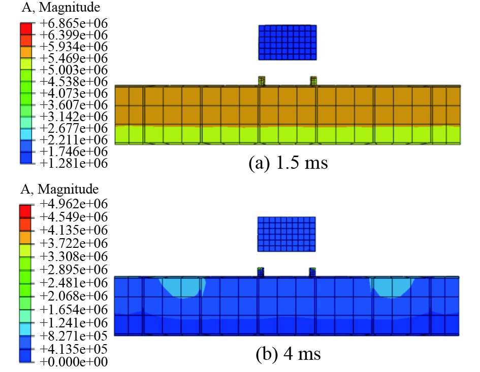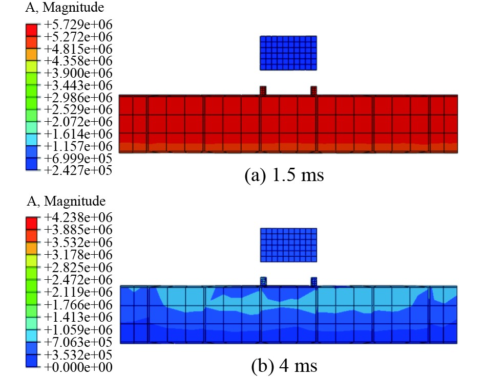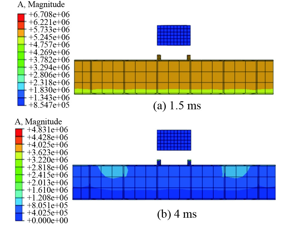 图 9 不同时刻加速度云图(1.2倍阻尼工况) Fig. 9 Acceleration contour maps at different moments(1.2 times damping condition) |