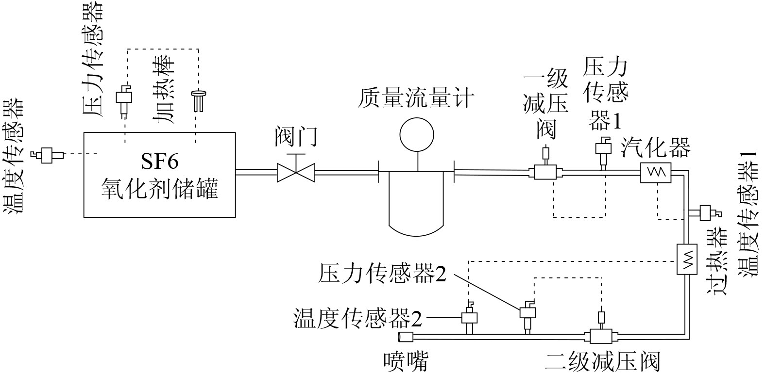 1 系统工作原理图1为SF6氧化剂供给调节系统的工作原理。储罐内SF6处于气液饱和态,工作时储罐内液态SF6排出使得温度和压力降低,故采用电加热器对储罐内液态SF6进行加热保持稳定恒定即压力恒定。系统接收供给指令后储罐内高压液态SF6经过一级减压阀节流降压,将压力调节至指定范围内,但因节流效应部分饱和液态SF6会出现汽化,形成气液两相流。气液两相SF6在汽化器加热下完全汽化成为气态SF6,再进一步经过过热器加热成为设定温度的过热气态SF6。过热气态SF6经过二级减压阀进一步节流降压达到设定压力,此时在喷嘴前获得设定压力和温度的过热气态SF6。过热气态SF6进入喷嘴后在其内部达到临界音速状态,不受环境背压的影响,仅通过调节喷嘴前过热气态SF6的温度和压力即可精确调节其供给流量。