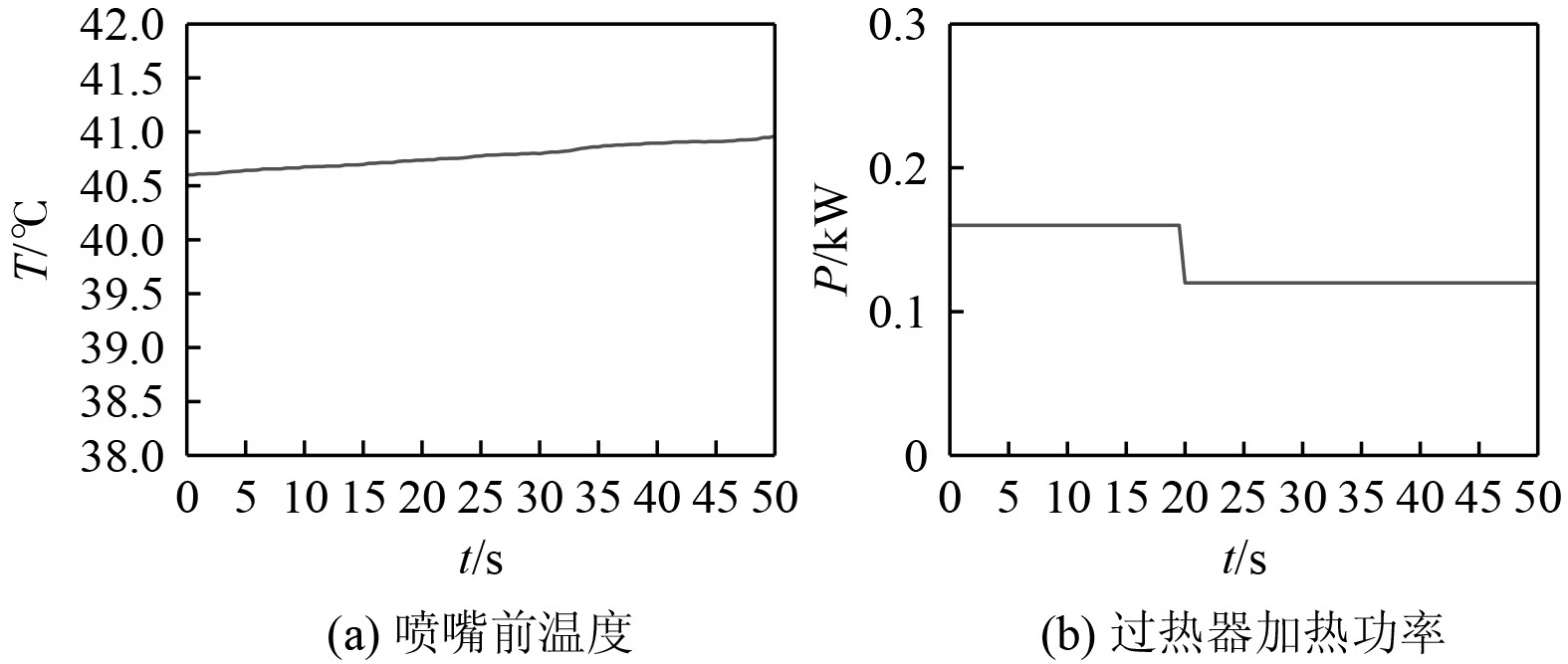 图10为一级设定压力阶跃时系统温度和加热功率的变化。可以看出,过热器加热功率从0.16 kW降至0.12 kW,而随着SF6流量的减小温度略微上升,这是由于温度调节的滞后性以及管路热容导致的,系统也会自动对温度进行修正,气态SF6始终处于过热态不影响喷嘴流量。