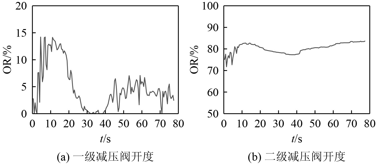 图5为一级减压阀和二级减压阀的开度随时间的变化。可知,一级减压阀的开度尽管在4.0%左右波动,但却能够及时调节液态SF6的压力并保持稳定。二级减压阀的开度在83%左右,未随时间发生明显波动,可知二级减压阀的闭环控制较为稳定。