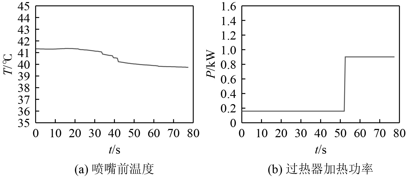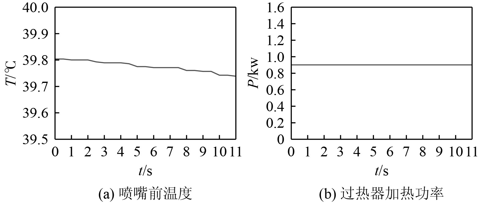 图6为系统温度和加热功率随时间的变化。可知,喷嘴前过热气态SF6温度稳定在39.8℃,与设定温度40℃吻合较好,过热器的加热功率约为0.9 kW,达到了热平衡。