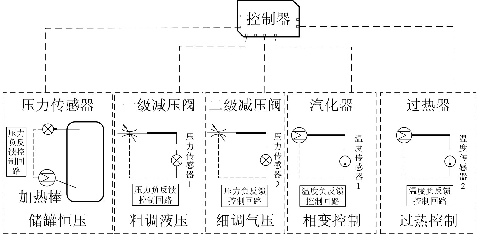 系统采用分散控制架构,主要分为压力控制和温度控制,包含5个相互独立的闭环PID控制回路。如图2所示,各控制器仅依赖本地传感器反馈实现设定点跟踪。两级压力控制:一级压力控制通过压力传感器1和一级减压阀构成闭环负反馈控制回路,对液态SF6进行粗调,二级压力控制则通过压力传感器2与二级减压阀构成闭环负反馈控制回路,对过热气态六氟化硫再次进行精调。两级温度控制:一级温度控制回路由温度传感器1和汽化器组成闭环负反馈控制回路,对液态SF6初次加热完成相变,二级温度控制回路则同样通过温度传感器2与过热器构成闭环负反馈控制回路,对相变后的SF6再次加热,使其变为过热状态。