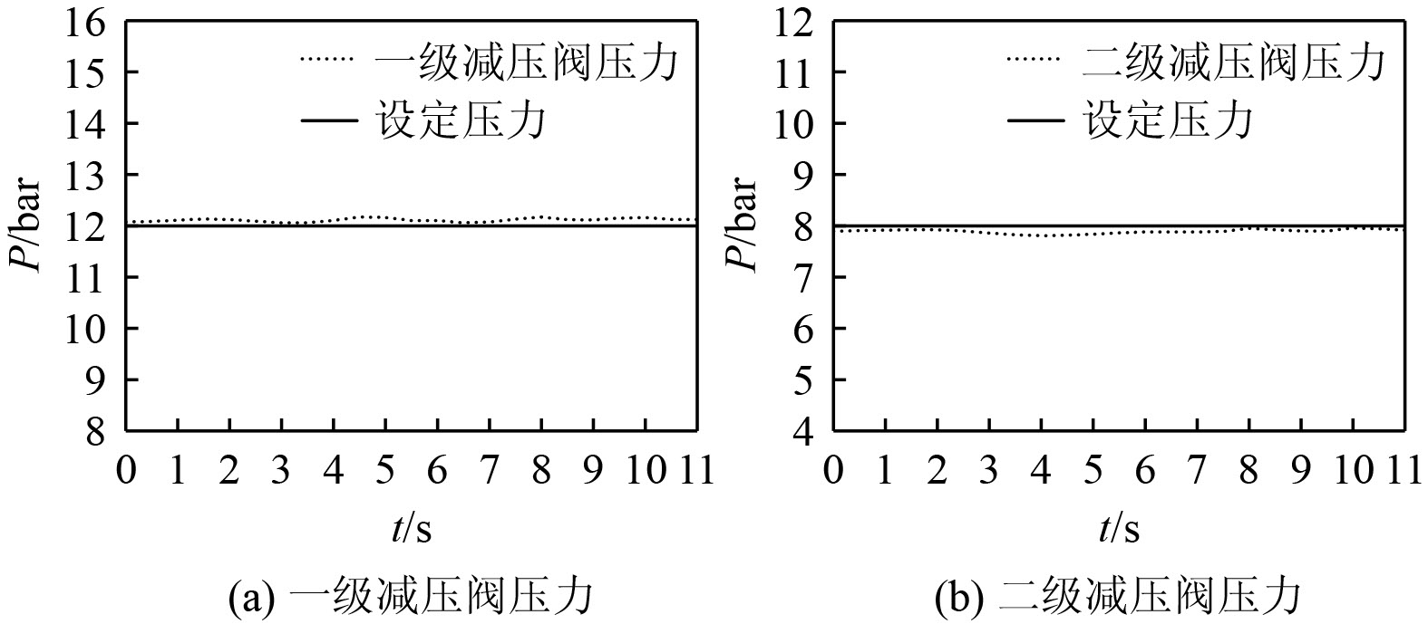图11为两级设定压力阶跃时系统供给压力的变化。从图11(a)可知,一级减压阀设定压力由10 bar阶跃至12 bar和二级减压阀设定压力由5 bar阶跃至8 bar时,一级减压阀经过30 s才稳定在设定压力,系统一级供给压力调节时间较长,这可能是由于两级压力同时调节相互干扰导致的。从图11(b)可知,喷嘴前设定压力由5 bar阶跃至8 bar时,二级减压阀经过14 s就稳定在设定压力,在一级减压阀影响下二级减压阀仍能快速调节和稳定喷嘴前压力,波动幅值在0.2 bar以内,表明系统两级压力闭环控制系统具有良好的动态响应特性,可以精确调节系统的供给压力,能够满足使用要求。