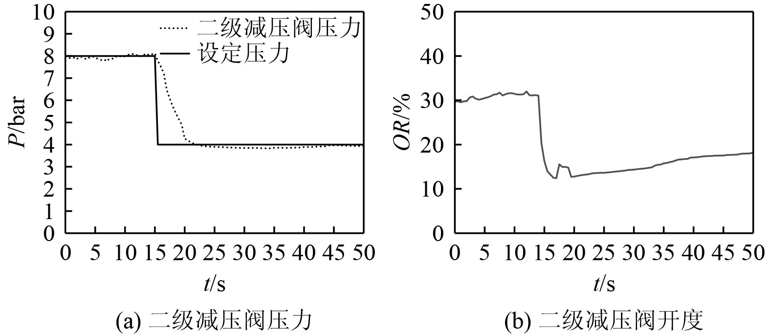 图9为设定压力由8 bar突降至4 bar时系统的动态特性。从图9(a)可知,二级减压阀的压力经过5 s时间从8 bar迅速减小并稳定在4 bar,供给压力波动幅值在0.15 bar以内,表明系统可以迅速调节供给压力,动态响应特性较好。从图9(b)可知,二级减压阀开度从30%快速减小至11%左右,由此可知,系统在供给压力突降时具有良好的动态响应特性,能迅速减小SF6氧化剂供给流量。