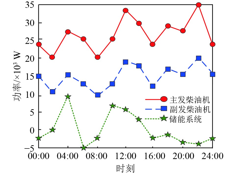 可知,主发柴油机功率稳定于20×103~35×103 W高效区间,避免低载运行,提升燃油经济性并降低船舶能效指数。副发柴油机作为灵活调节单元,在10×103~20×103 W区间波动,根据总负荷变化主动调整输出,优先确保主发高负荷运行,实现“主稳副调”的经济调度目标。储能系统功率在−5×103~10×103 W间波动,通过充放电行为有效平抑负荷突变与可再生功率波动,补偿柴油机惯性不足,减少额外发电机启停,进一步优化系统燃油消耗。在正常航行工况下,该方法通过主副发协调与储能辅助,显著提升了船舶电力系统的运行稳定性和整体经济性。