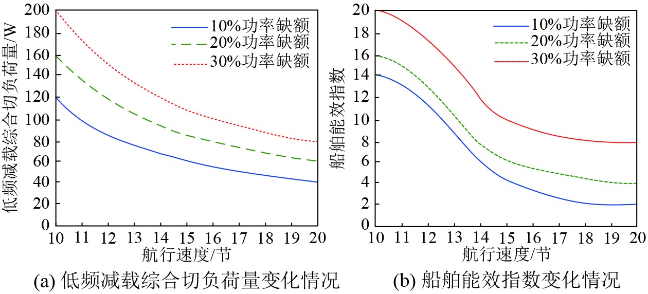 在低频减载航行工况下,应用本文方法前,该船舶电力系统在10%、20%、30%功率缺额下,最大低频减载综合切负荷量分别是220、290、350 W,最大船舶能效指数分别是17、21、34。分析应用本文方法后,不同船舶航行速度以及不同功率缺额下,该船舶电力系统的低频减载综合切负荷量与船舶能效指数的变化情况,分析结果如图3所示。