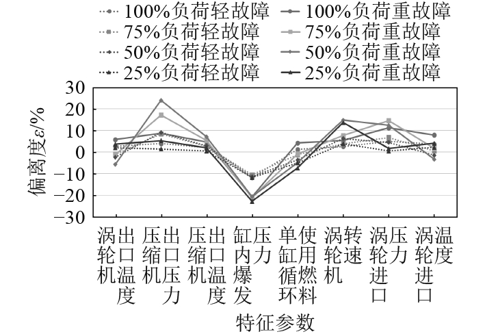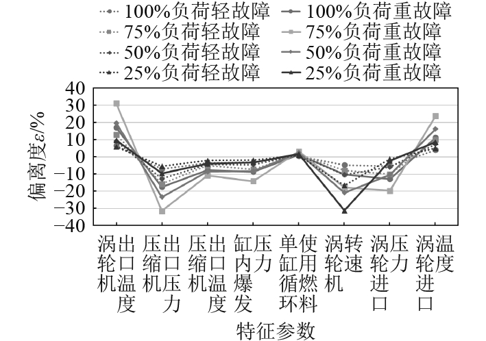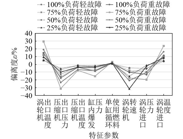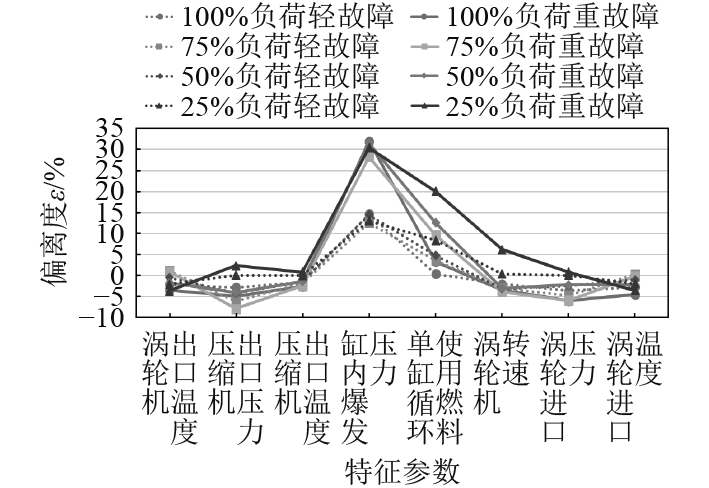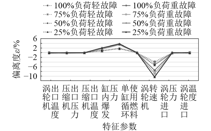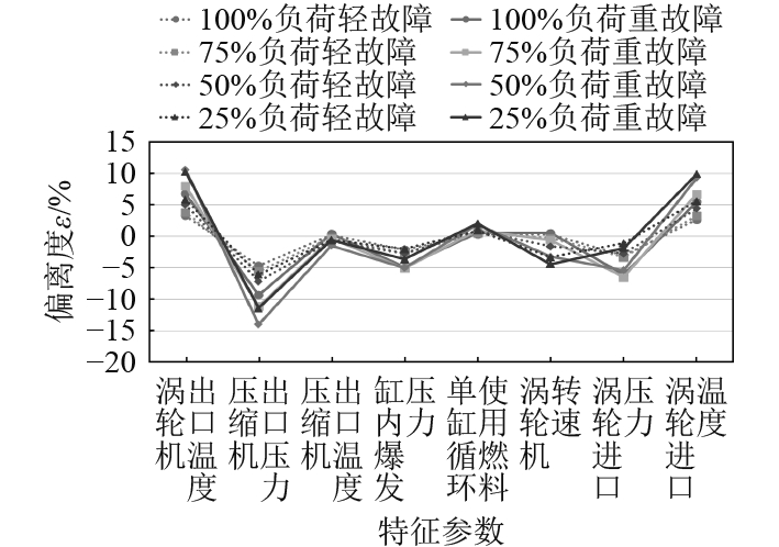 根据上述设置调整模型,进行各个工况、各个故障下的仿真。计算故障状态下各个特征参数与标准状态下的相对偏差,计算方法为[15]: