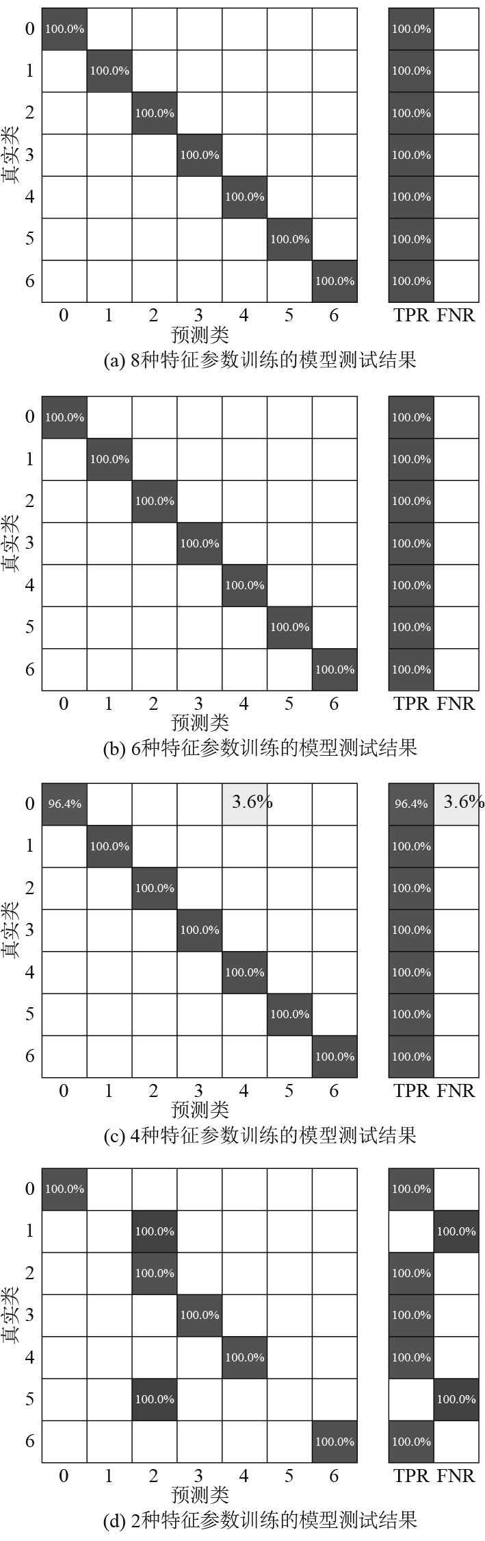 当考虑动态工况下的故障诊断模型时,可以参考表4中的平均排名来筛选参数,但仅考虑稳态工作过程时,针对特定工况筛选数据更佳。本文以保持100%输出功率的稳态工况为例,假定一次仅出现一种故障,分别保留评分最高的8、6、4、2种特征参数,训练神经网络诊断模型。该神经网络模型共2层全连接层,每层大小为10,激活函数为ReLU。本文调整故障程度后重新对modelica模型进行仿真,得到若干组新数据作为测试集测试训练完成的神经网络模型,结果如图8所示,其中编号0−6分别表示正常状态(0)、压缩机效率下降(1)、涡轮机效率下降(2)、空气滤清器堵塞(3)、单缸供油减少(4)、喷油正时提前(5)、喷油正时滞后(6)。