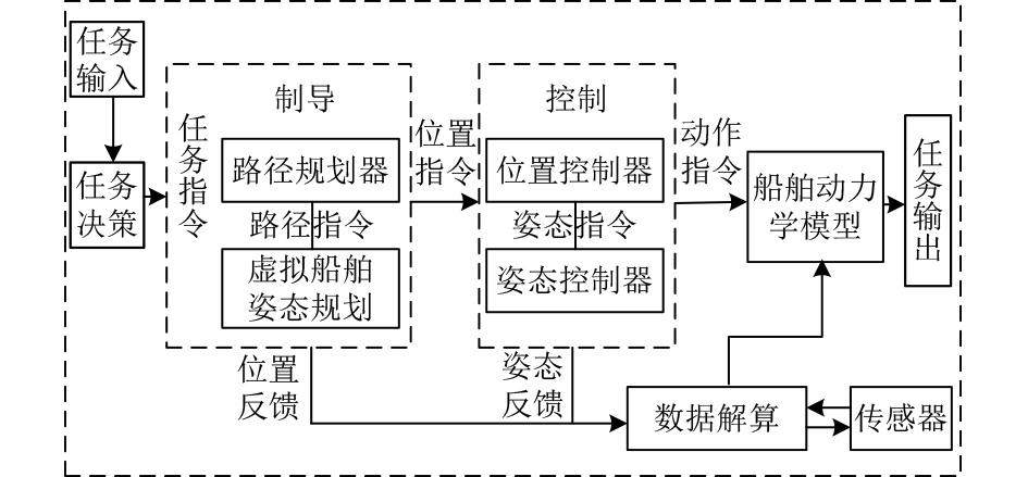船舶导航控制是指通过导航系统、控制算法和执行机构等,使其按照预定的起讫点规划出一条最优航线,使船舶在复杂环境中安全、高效、精准航行的技术和方法。当前,船舶导航控制的内涵不再仅限于传统的定位与避障,而是深度关联了船舶的整个航行过程,包括“制导”与“控制”2个核心模块[3],船舶导航控制体系如图1所示。制导是指根据操纵人员设定的航路点信息、航行水域障碍物分布、船舶会遇情况,实时规划出平滑且可行的参考路径;控制是指根据船舶运动姿态、速度变量及制导系统给出的参考路径计算并确定执行航行任务所需的控制指令。