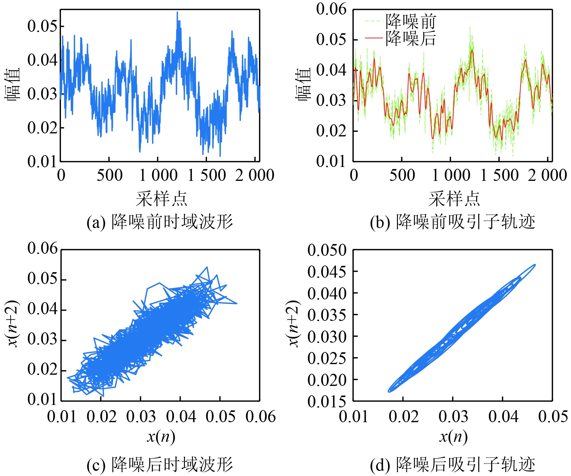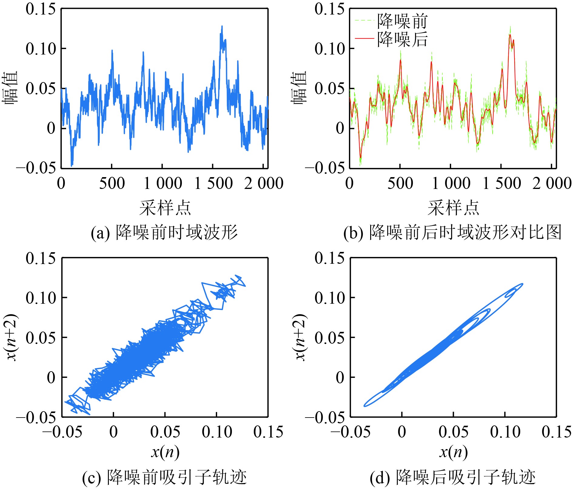 图 9 降噪前后第一类舰船辐射噪声信号和吸引子轨迹 Fig. 9 First type ship signal and attractor trajectories before and after denoising |