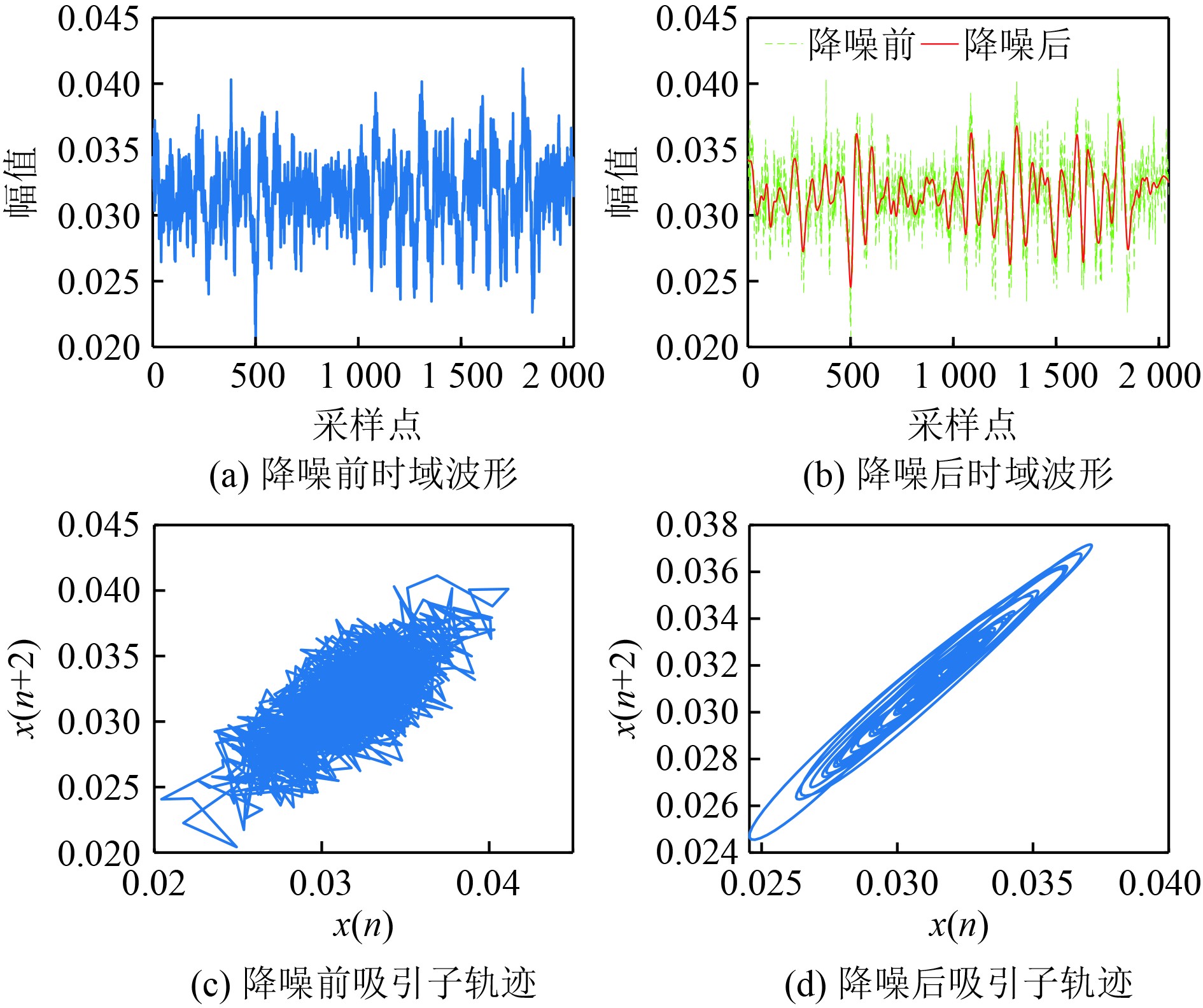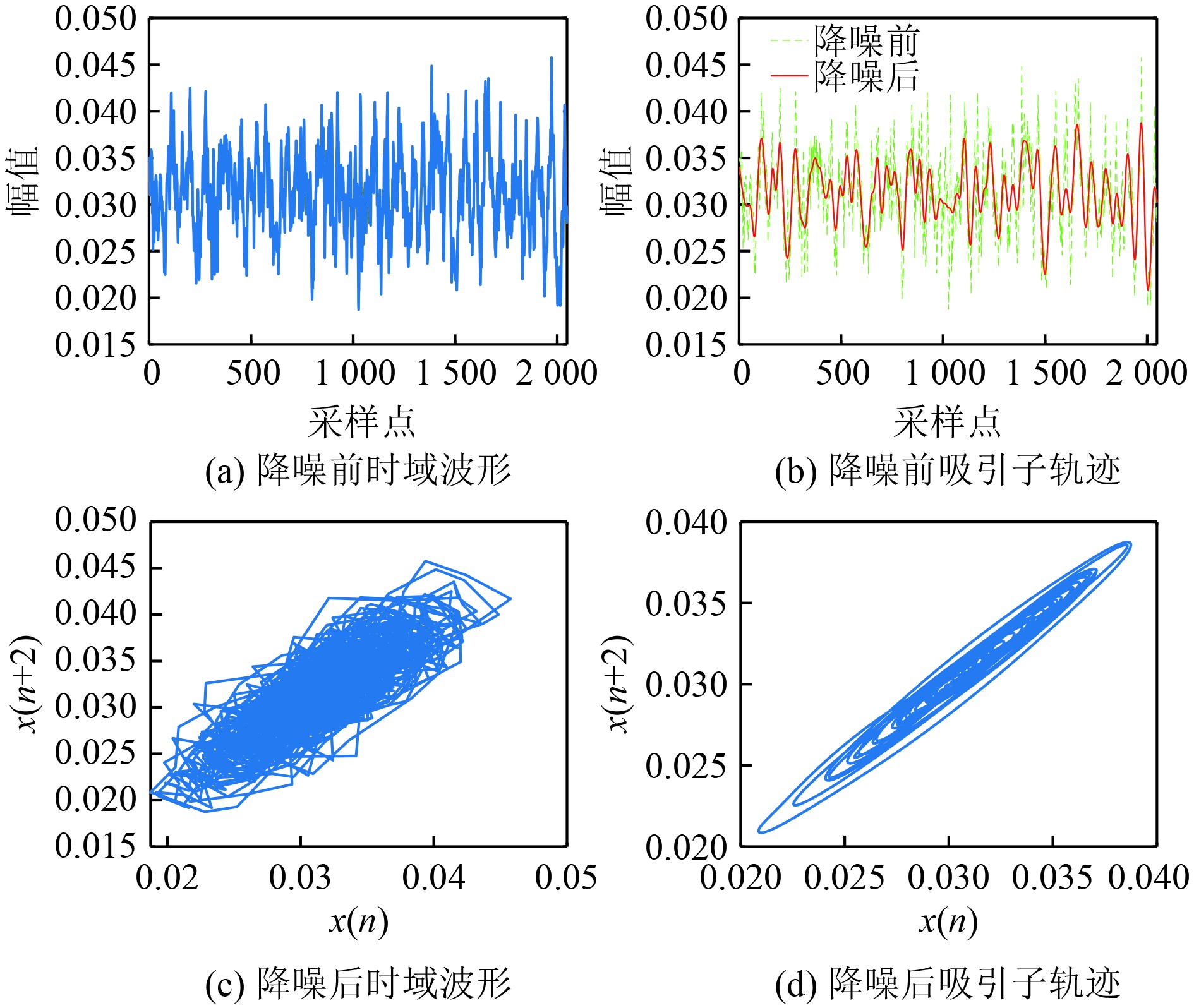 为了定量评价降噪结果,通过信噪比(SNR),均方根误差(RMSE),最大李雅普诺夫指数(MLE)的方法来对比降噪前后的效果。