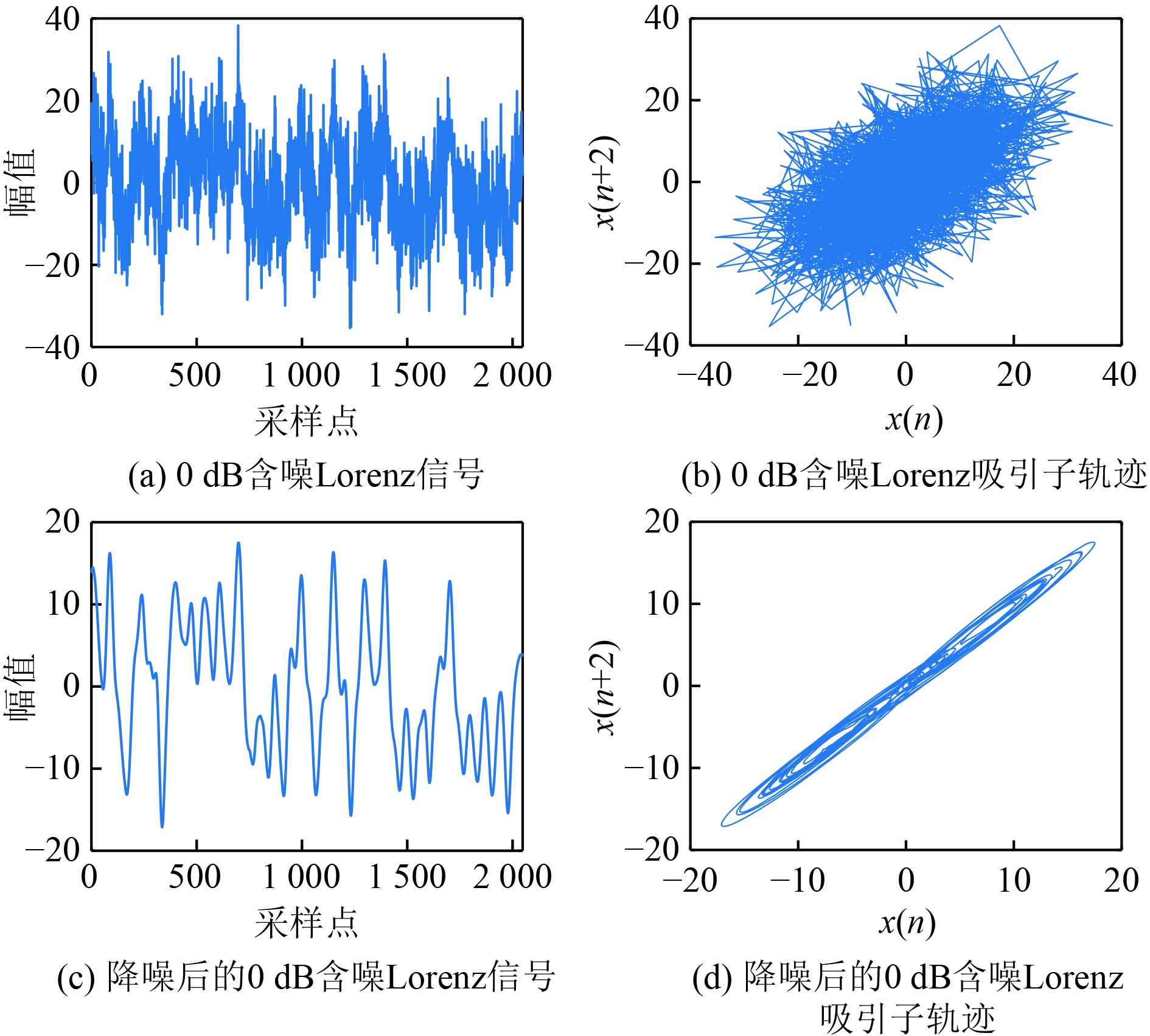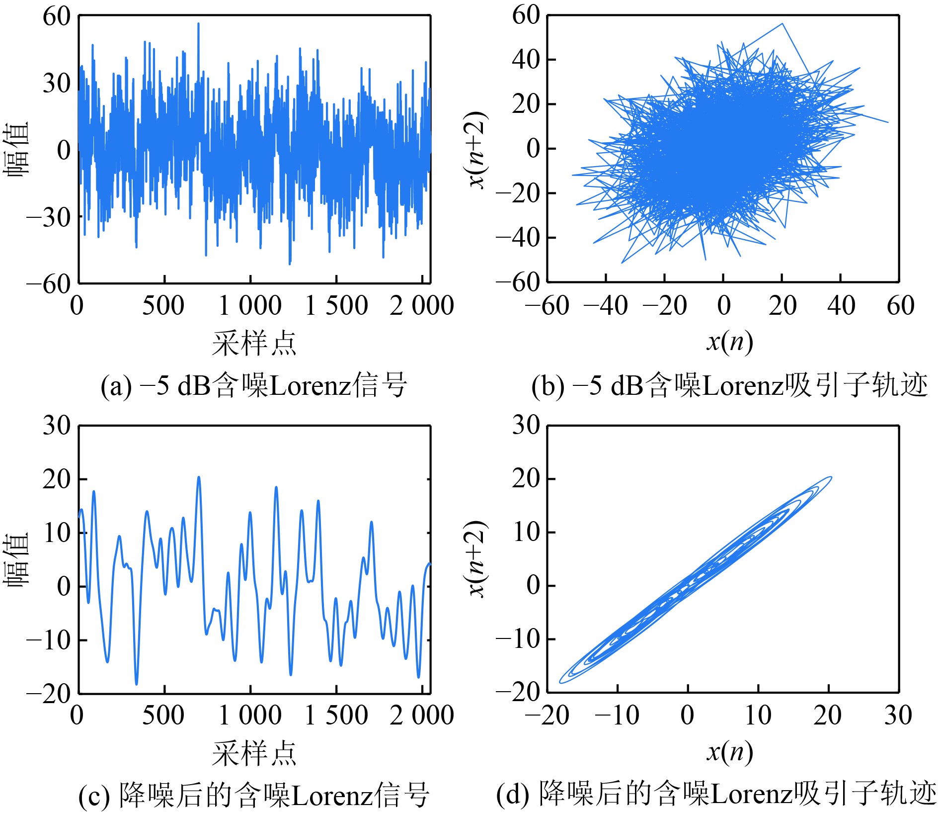 由图6~图8可知,无噪声Lorenz吸引子轨迹光滑且有一定规律,而含噪Lorenz信号的吸引子轨迹无明显规律。采用提出的降噪方法对−5 dB和0 dB含噪Lorenz信号降噪后,其时域波形更接近原信号,降噪后的Lorenz吸引子轨迹也较光滑且有规律。