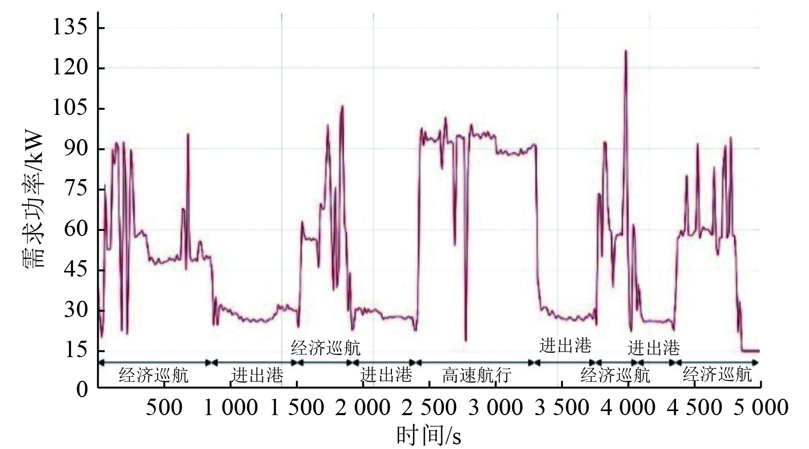 图1为该渡轮在典型工况下的负载曲线。船舶典型工况分为三阶段:经济巡航(0~90 s),功率稳定在45 kW;靠港(90~135 s),负载波动剧烈,峰值达100 kW;离港(160~190 s),功率升至110 kW。全程功率需求范围为0~110 kW,平均功率约42 kW。