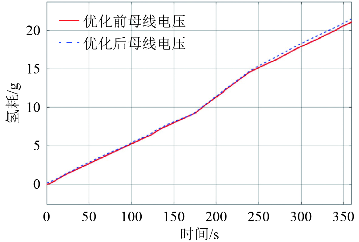 如图10所示,优化后典型工况下的等效氢耗约21.35 g,仅较优化前增加0.47%,几乎持平。其原因在于锂电池容量提升后略多承担功率,而系统整体功率消耗有所下降,这部分功率差由燃料电池补充,导致等效氢耗微增。