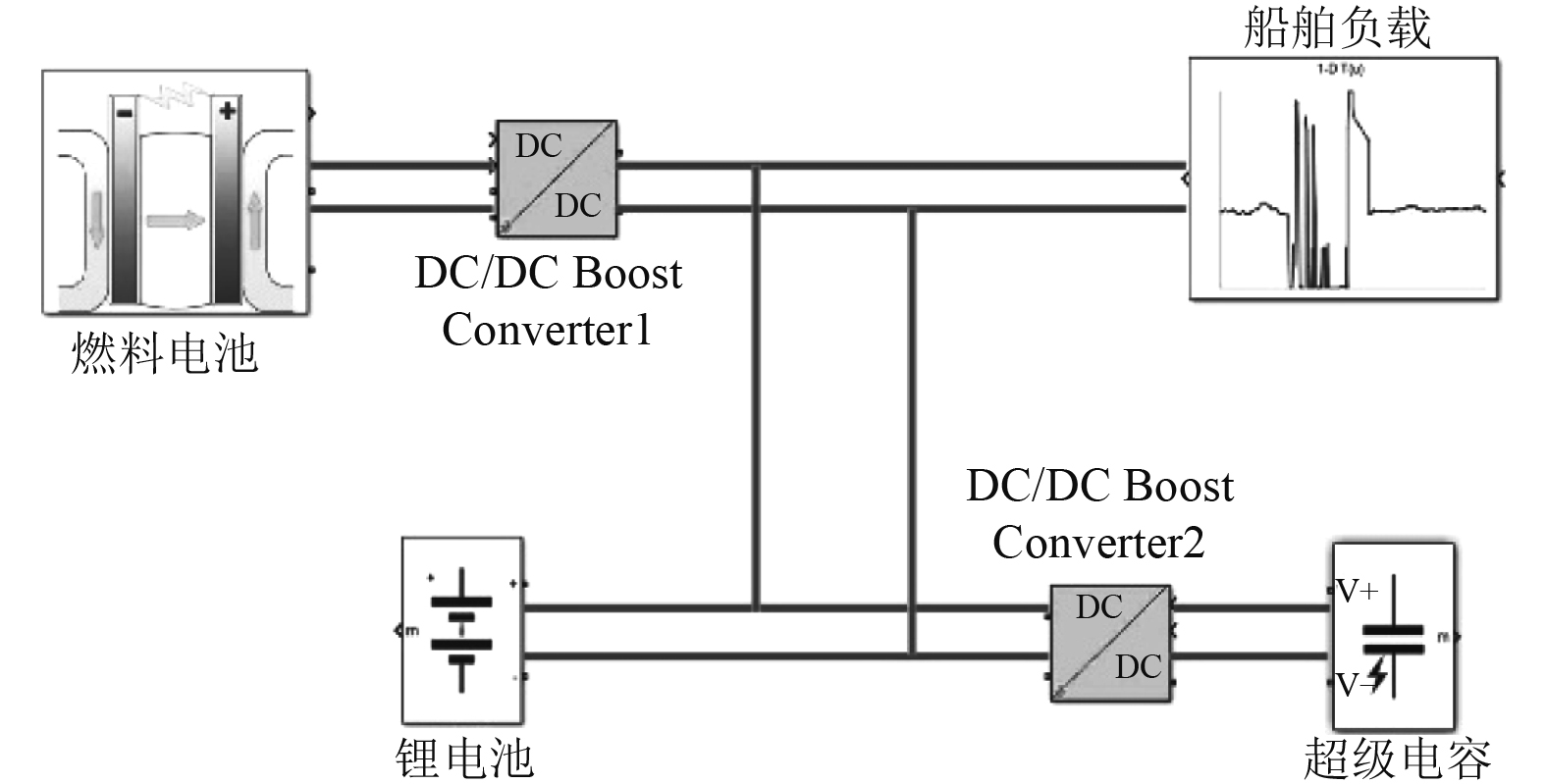 改进后的混合动力船动力系统结构如图2 所示。该系统集成了燃料电池、锂离子电池和超级电容3种能源单元,并分别通过2个独立的 DC/DC 升压转换器对燃料电池与超级电容进行功率调节,以期实现在多动力源并行供电下对负载需求的动态响应与高效协同。