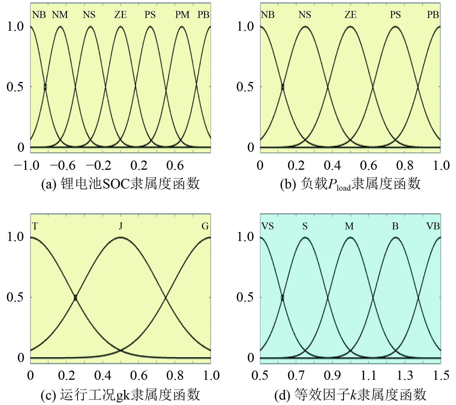 本文基于模糊逻辑理论构建了等效因子计算模型,以应对复合储能系统在不同运行状态下的模糊性与不确定性。在控制器设计中,通过锂电池SOC和负载功率波动幅度与等效因子之间的模糊隶属函数及规则库,实现对系统能量分配的自适应调整。本文选择将负载