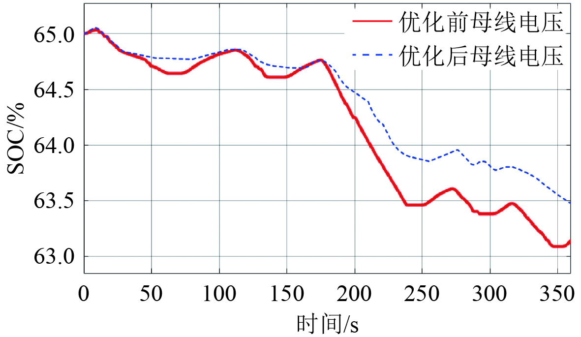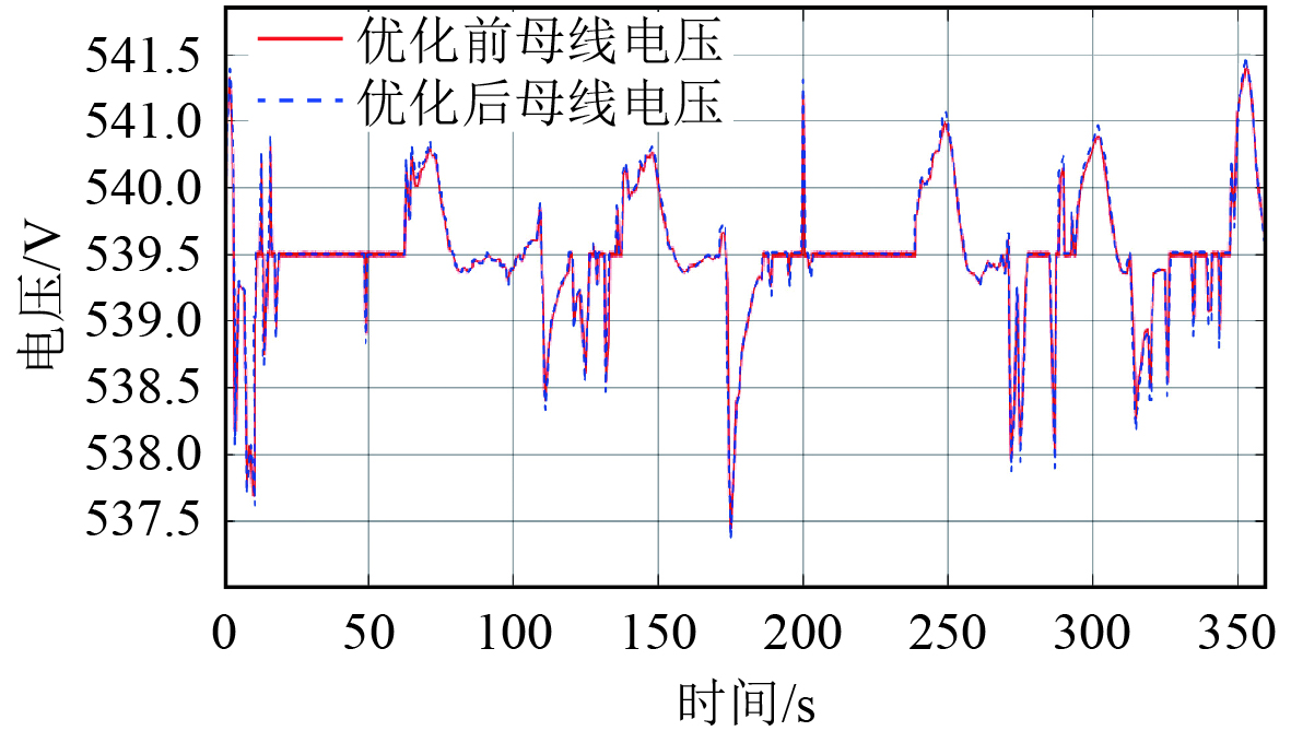 图7为优化前后直流母线电压的实时曲线,在完整运行周期内,优化后的复合储能系统依然具备优秀的充放电性能,结合能量管理策略,可有效维持母线电压稳定并保障电能质量。