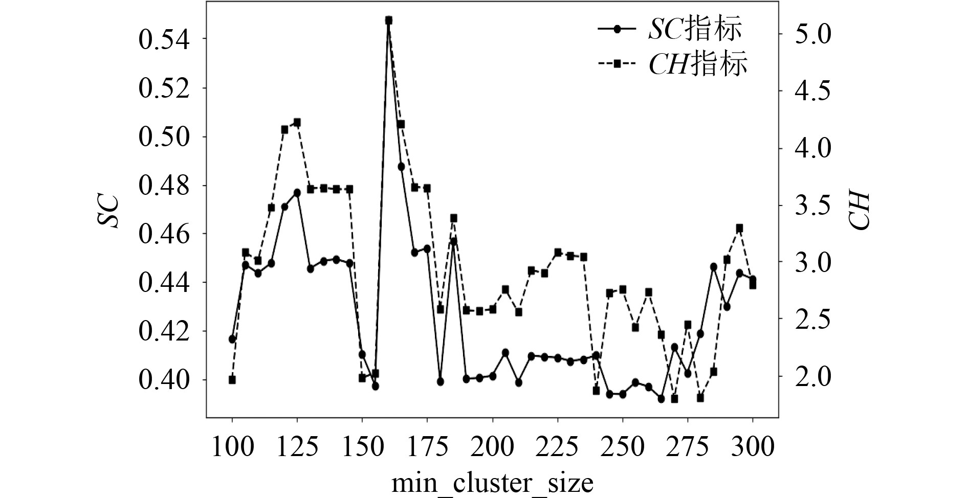 在聚类性能的评估过程中,本文依托 SC与CH 这2项指标,针对最小聚类规模的取值区间(100~300)实施了参数调优操作,以选择最优的最小聚类大小作为HDBSCAN算法的输入值。最小聚类簇大小的最优值是得分最高的SC和CH时对应的最小聚类簇值,最小样本采用默认方案,即最小样本值等于所选择的最小聚类簇值。从图2可以看出,SC和CH在最小聚类簇大小为160时值均为最大,此时SC值为