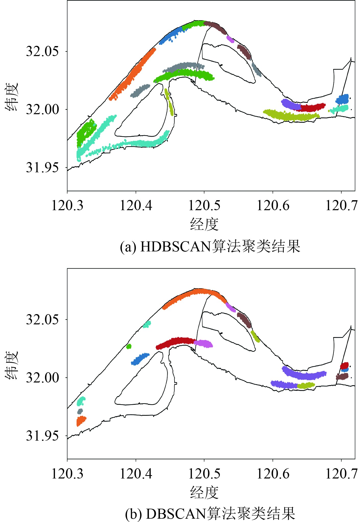 为验证聚类方法地适应性与效果,本文对比运用了 DBSCAN 与 HDBSCAN 这2种算法。由图3 可知,HDBSCAN 于低密度区域的识别能力显著强于 DBSCAN。DBSCAN算法依赖固定的全局距离阈值,难以同时适配高密度与低密度区域,致使大量稀疏轨迹点被误判作噪声,进而引发聚类结构的片段化与丢失。HDBSCAN 通过构建基于局部密度地层次结构,自适应地识别不同密度的簇,有效保留了边缘轨迹与稀疏区域,其聚类结果在结构完整性与连续性方面呈现更优态势,尤其适用于内河水域这类密度差异显著地轨迹数据。