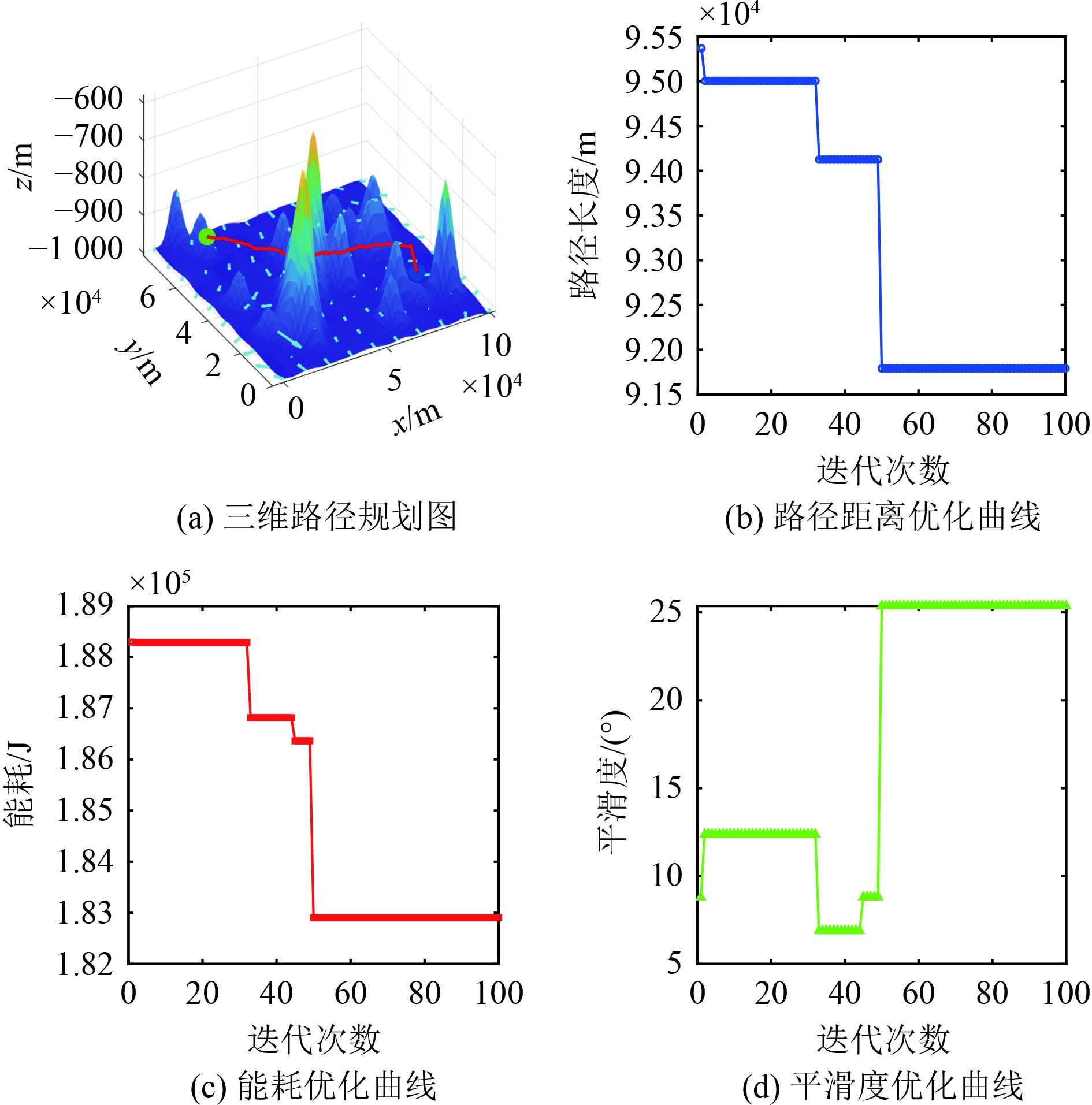 AUV在海底运行时候,所提供的能量比较难获得,此外为了AUV保证运行的安全性能,需要较小的转角,故AUV在执行任务时候,需要尽可能地降低能量消耗和转角差。为保证AUV在进行路径规划时获取一条高效、平滑度高且能耗低的综合路径,选用多目标函数为综合性能指标。