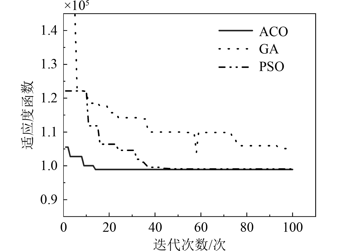 可知,本文改进的算法相比粒子群算法和遗传算法收敛速度更快,并且在相同的适应度函数下能够取得更优解。