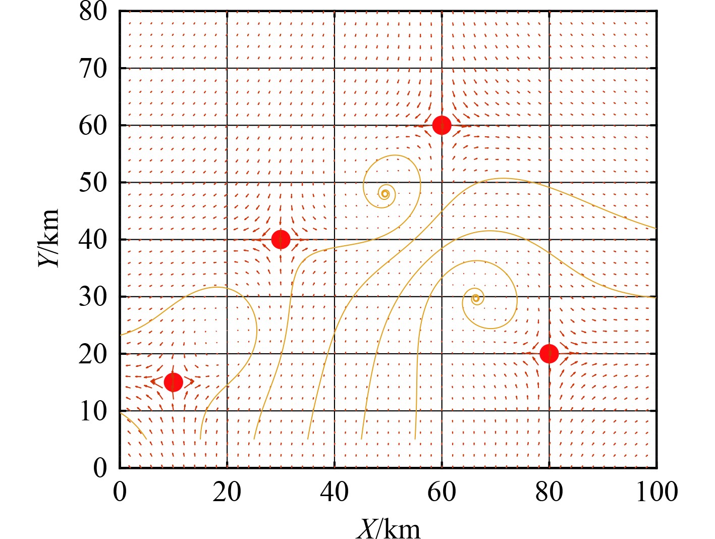 考虑到AUV航行速度较低,因此由涡流形成的洋流对AUV的能耗必须要考虑。一个湍流的海洋环境可以模拟为多个分布的涡旋场叠加,如图3所示。根据文献[23-24],在