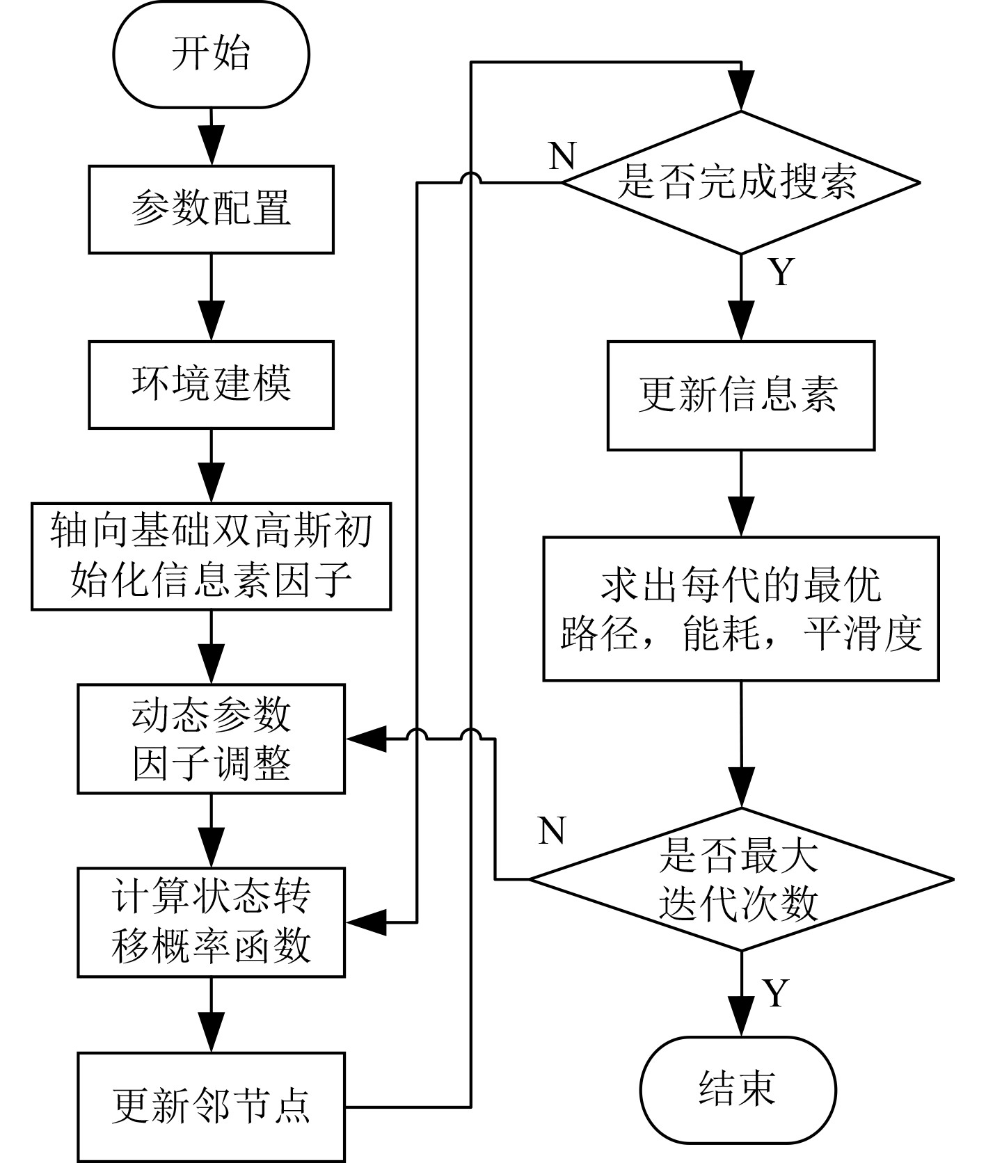 1)使用轴向-基础双高斯初始化信息素因子、并通过对信息素因子,启发函数因子以及挥发素因子进行自适应改进,可以有效加快算法的收敛速度以及路径规划的有效性能。