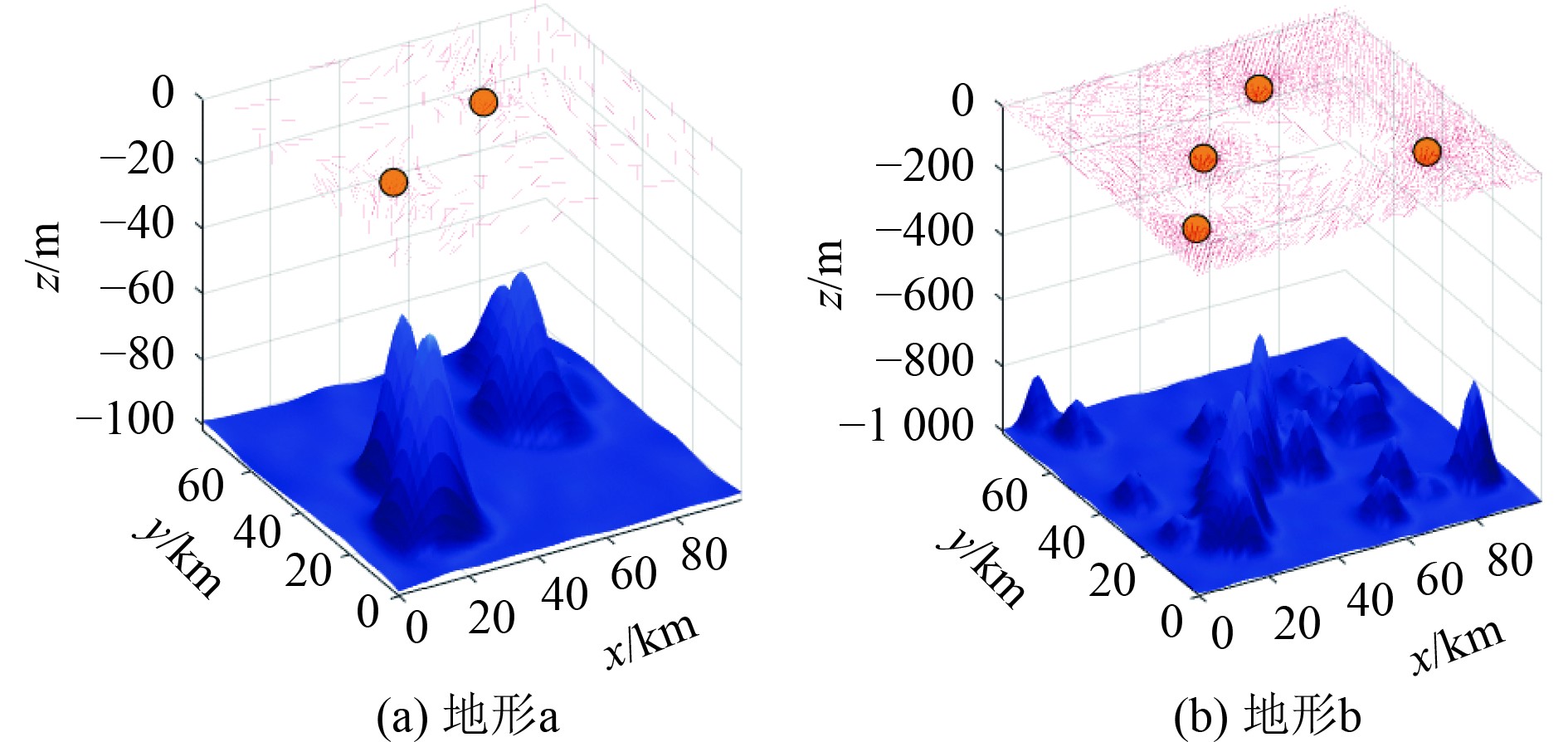 为了验证本文所提算法的性能,进行了相关实验验证,首先验证本文所提算法的效果,重复进行了2种环境下的实验。图6中情形a为比较平坦,障碍物比较少,近海岸的情形,同时涡流比较少,涡流影响范围也较少,只有2个弱涡流,影响范围广,但是强度小;情形b为地形起伏比较大,分布不规则,相互之间高度差比较大,4个强涡流,影响范围小,但是强度比较大。其情况配置地形和洋流的参数如表1所示。此外所提的改进蚁群算法其他相关参数分别为:
