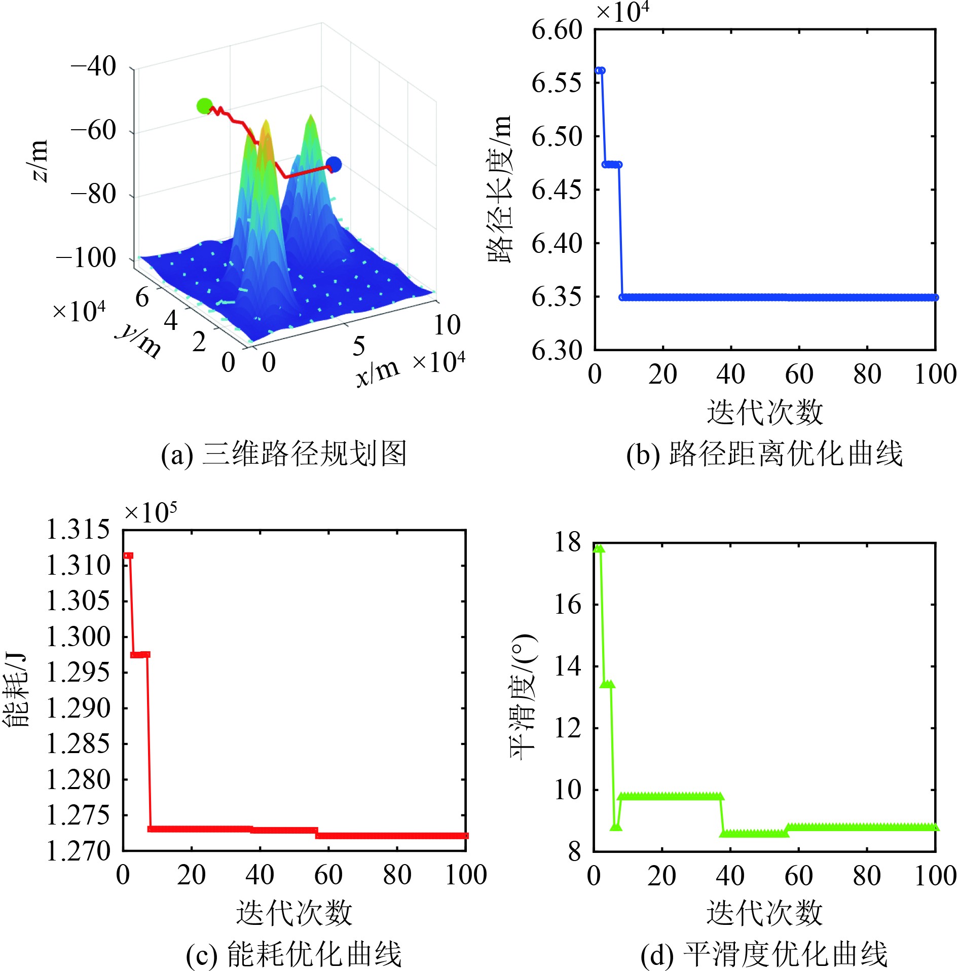 4 结 语本文提出一种考虑地形和涡流的AUV路径规划方法,通过多种情形下的仿真分析,得出以下结论:
