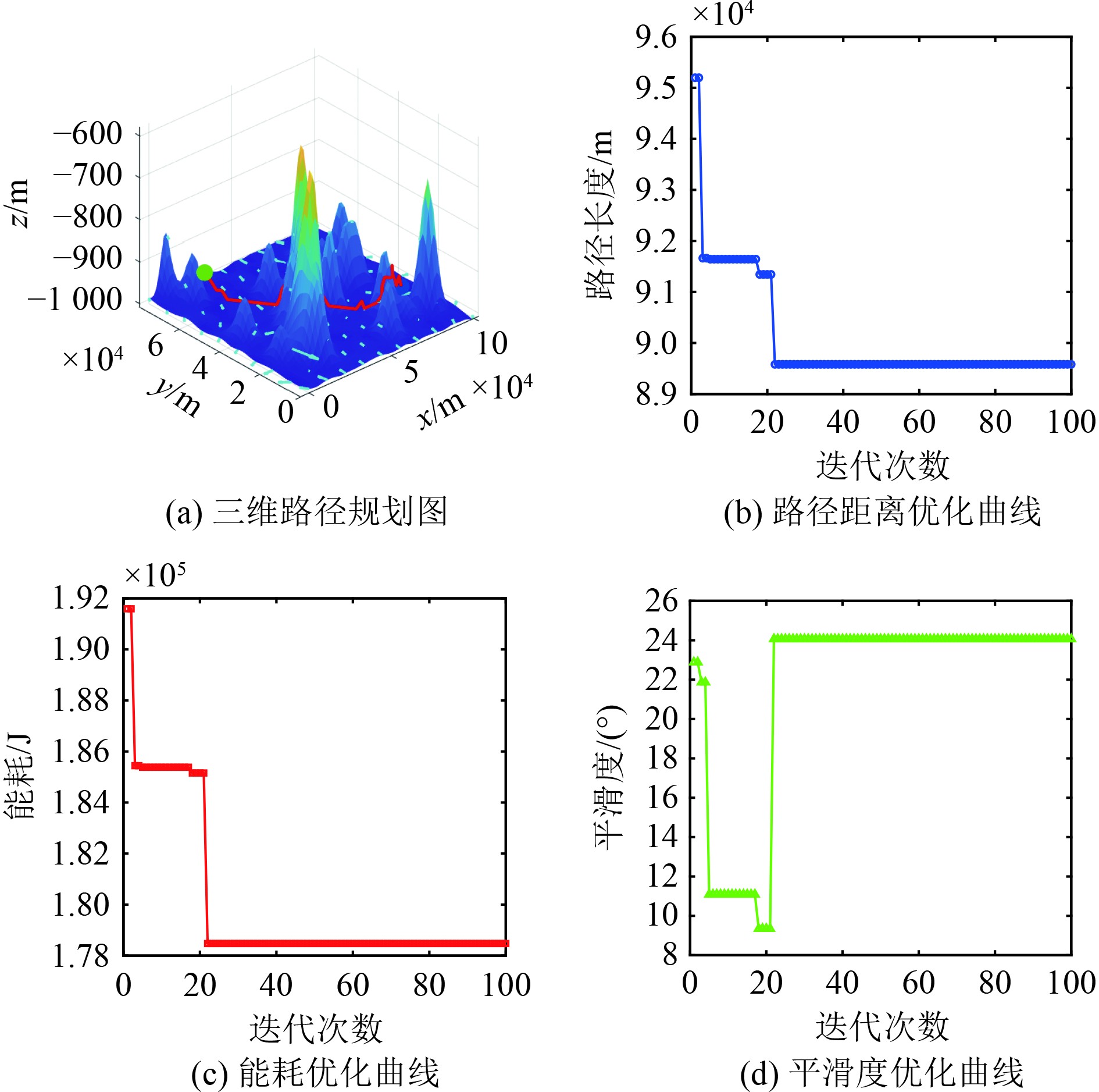 图 8 地形b的仿真结果(改进蚁群算法) Fig. 8 Simulation results of terrain b (Improved ACO) |