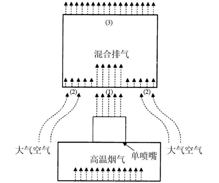 美国1975年服役的“斯普鲁恩斯”级驱逐舰采用了燃气轮机排气边界层红外抑制罩(BLISS-CAP)技术。该装置为单喷嘴引射器,其示意图如图1所示。引射器将燃气轮机的高温排气(一次流)与低温大气空气(二次流)混合,降低排气温度。