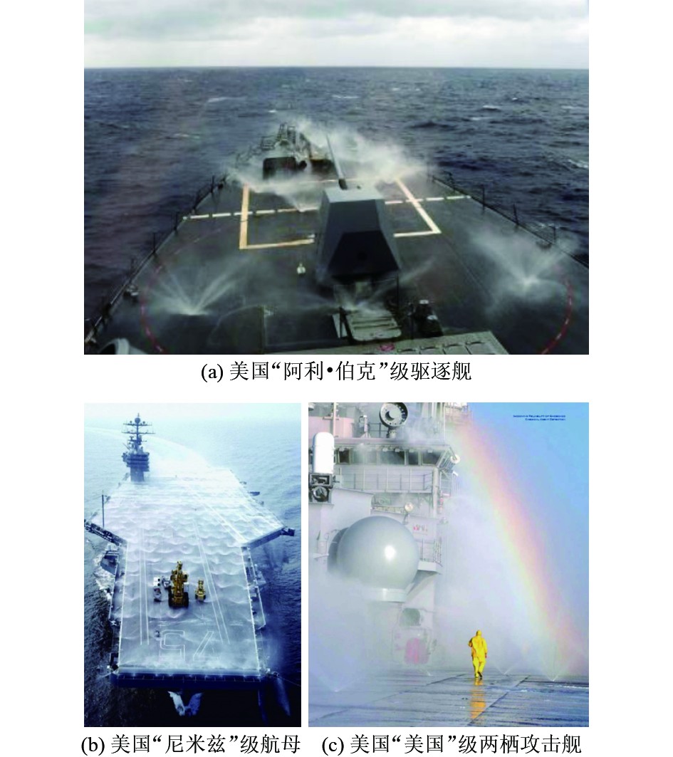 水雾遮蔽技术是在舰船(如美国“尼米兹”级航母、“阿利•伯克”级驱逐舰、“美国”级两栖攻击舰等)周围布设大量可自动控制的喷水装置,以在战时快速形成全覆盖水雾屏障(见图11)。这种技术通过2种机制实现红外隐身:一方面,水雾颗粒对舰体红外辐射产生强烈吸收和散射效应,显著削弱敌方红外探测设备接收到的信号强度;另一方面,水雾在舰体高温部位蒸发吸热,可有效降低表面温度,进一步减少红外信号[10 − 11]。