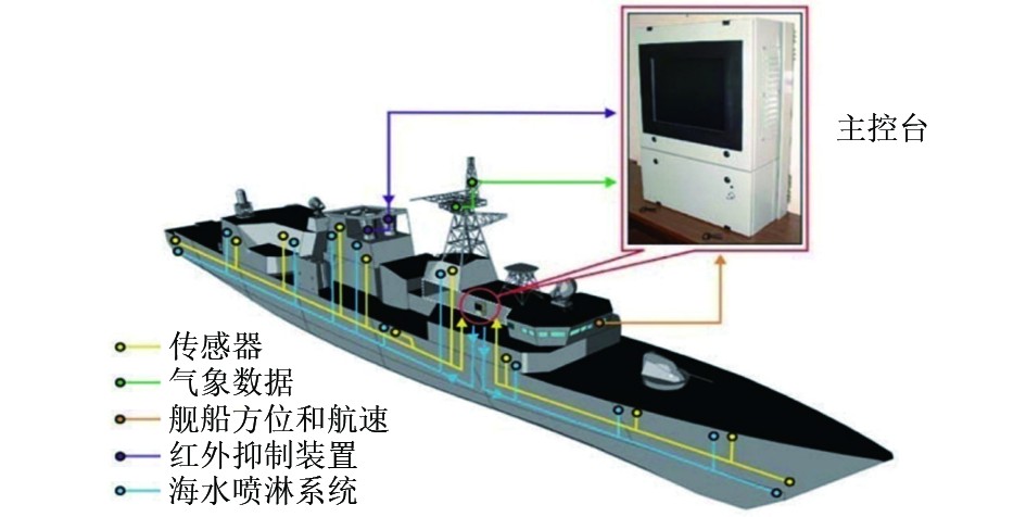 该系统(见图12)可通过系统传感器网络评估气象数据(如空气温度、湿度、风速、阳光等)、主机状况、舰船表面温度,以及舰船方位和航速信息等,利用主控台调节全舰红外水幕系统(即海水喷淋系统)和水雾型排气引射/扩压红外抑制装置的工作状态,实现最优红外抑制效果。