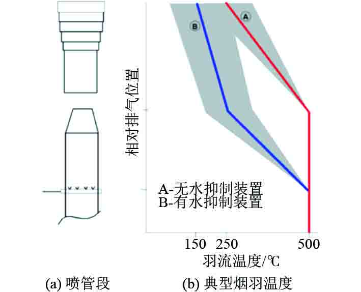 图 6 喷管段和水雾型排气引射/扩压红外抑制装置典型烟羽温度 Fig. 6 Typical plume temperature of the nozzle section and typical water mist-type eductor/diffuser infrared suppression device |
