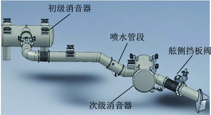 典型海水喷淋舷侧排气系统通常由初级消音器、喷水管段、次级消音器、舷侧挡板阀及排气管路等部件构成(见图8)。根据平台空间布局的实际需求,消音器可采用整体式结构设计。该系统设计的核心问题在于必须有效防止舷外海水倒灌进入发动机内,对于靠近舷侧的发动机,可采用倒U型排气管路布置方案。同时,需重点开展以下技术工作:排气背压校核计算,特别要考虑短时上浪工况对排气背压的瞬态影响;确保系统背压参数满足发动机运行要求,必要时可在保证舰船总体性能的前提下对发动机功率进行适当调整;对可能接触海水的管路及部件应采取专门的防腐措施,防止海水腐蚀影响系统可靠性[7 − 8]。