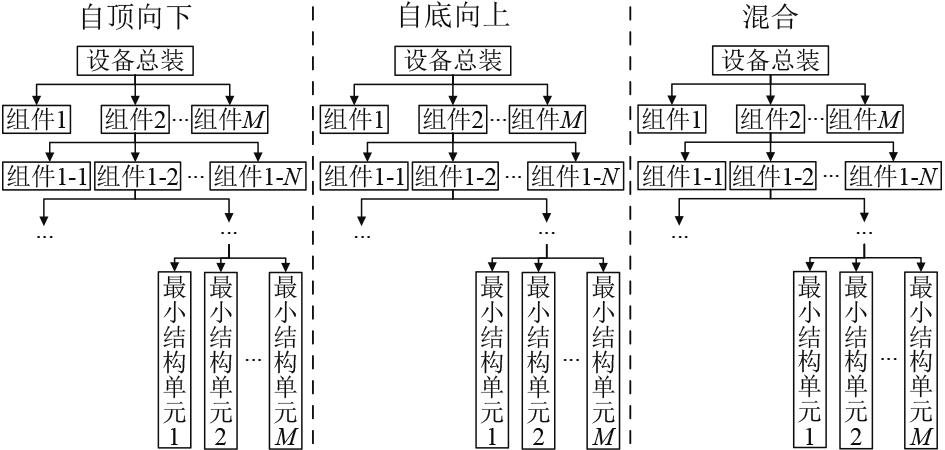 解析设备结构获取总体布局时,可采用自顶向下、自底向上或混合设计方法。如图1所示,自顶向下从设备整体或总体装配开始,根据装配需求逐步、逐层细化到最小结构单元;自底向上从设备的最小结构单元开始,根据装配需求将设计好的零部件模型添加到总体装配中;混合设计方法在设备总体设计方面采用自顶向下实现结构层次解析,在设备组件设计方面采用自底向上实现零部件关系解析。