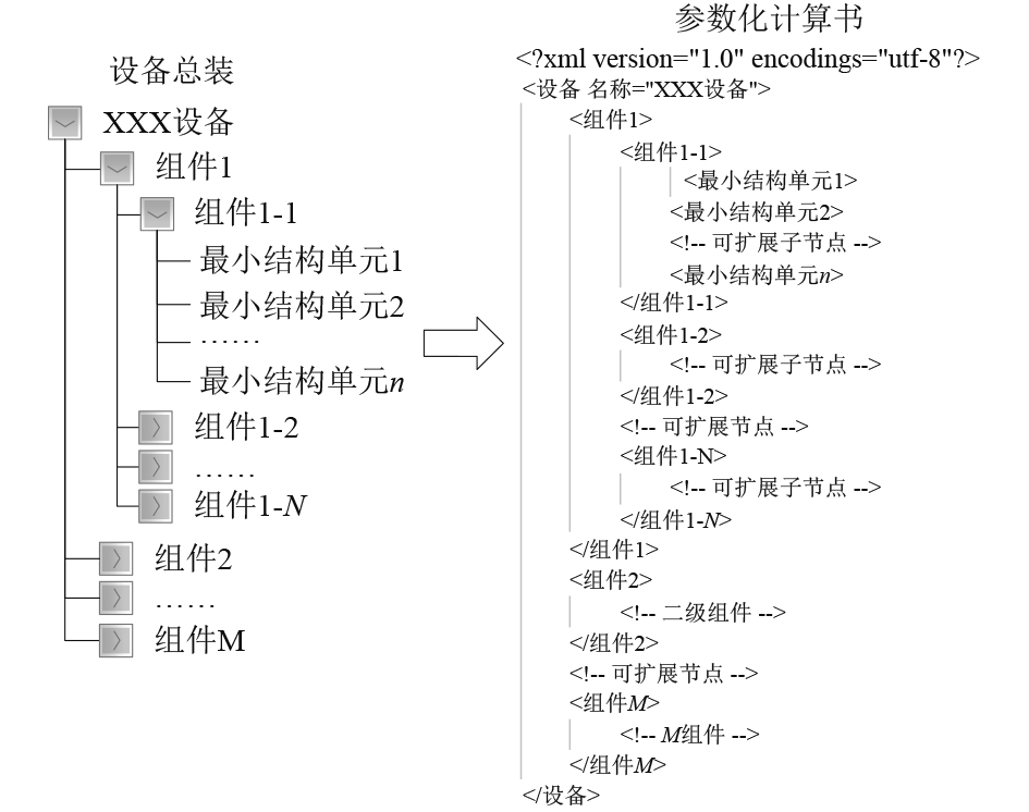 1.2.1 结构设计为建立参数化计算书与CAD工具间的连接,将参数化计算书设计为xml格式的系统配置文件,按照图2构建参数化计算书的结构层级,说明模型与设备总体装配的对应关系。