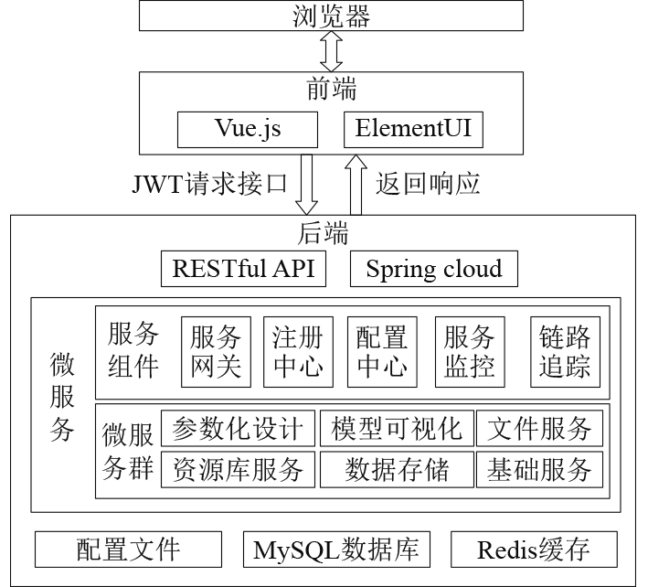 系统采用前后端分离架构实现用户交互与业务逻辑的解耦,采用微服务架构对业务逻辑进行拆分,使每个服务能聚焦单一的业务功能[19],形成“前后端分离+后端微服务化”的复合架构,如图4所示。前后端均可独立部署,框架升级互不影响。